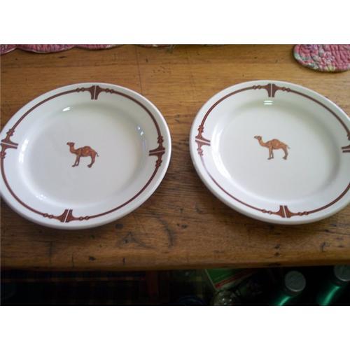 These are a set of 4 plates made by the Homer Laughlin Co. for Camel Ciggarettes.I purchased them new when you could order items from their catalog.I do not think you can do that anymore.I also have a set of the 4 coffee mugs that match the plates in a seperate listing.The plates and cups have never been used.They measure 9 1/2" across.