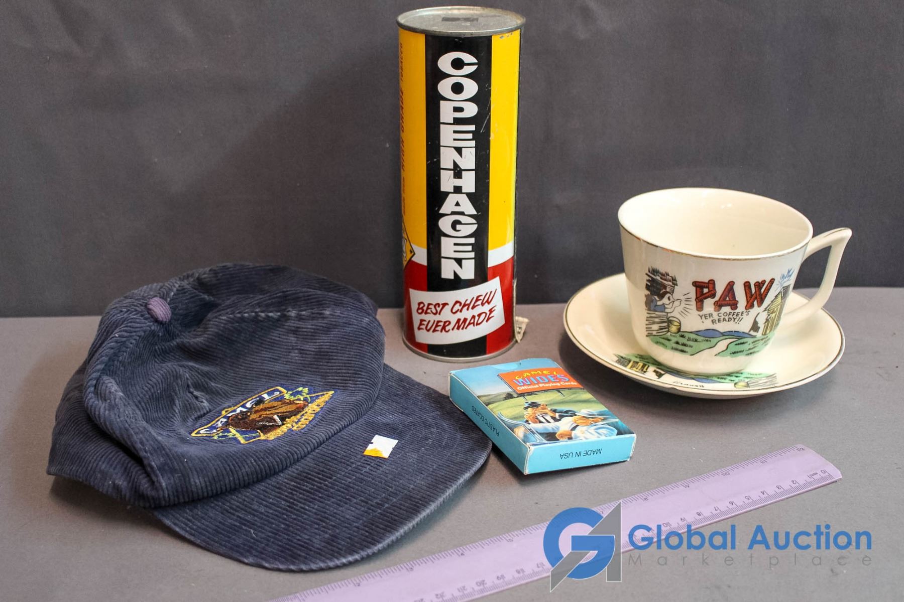 Camel Courdory Hat,Camel Playing Cards, Copenhagen Tin Roll, "PAW" Cup & Saucer
