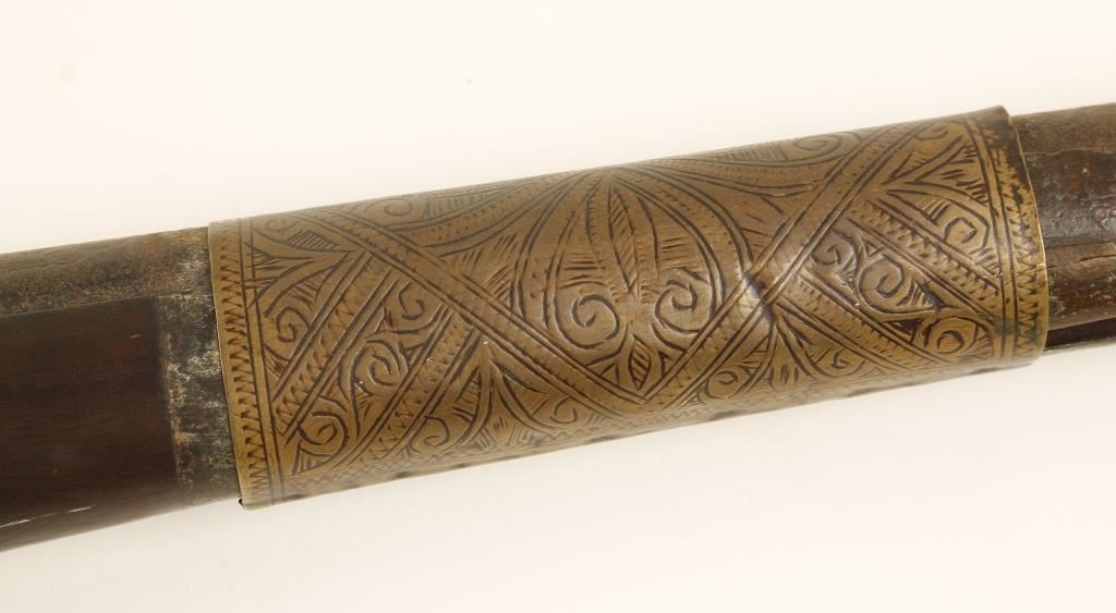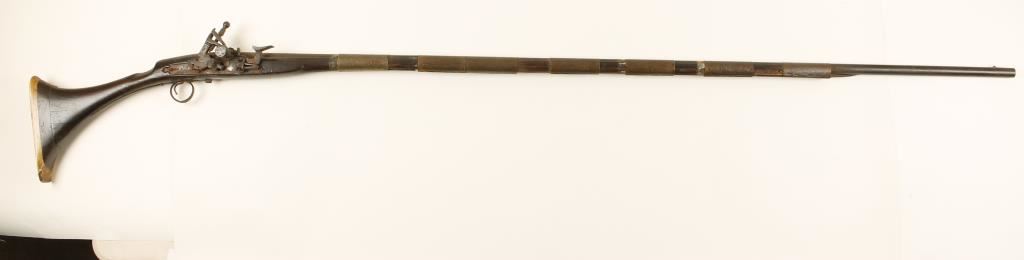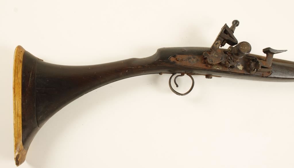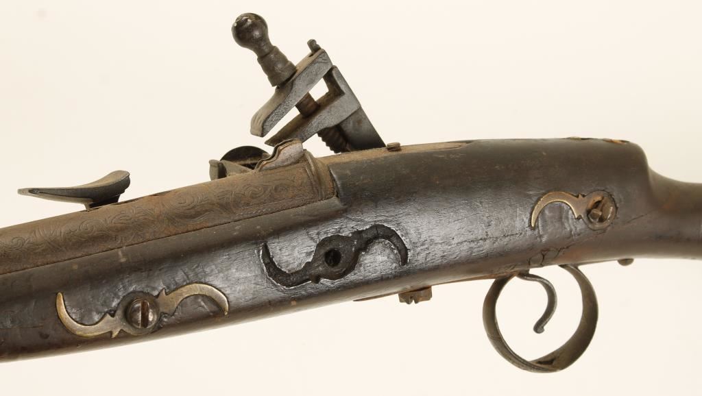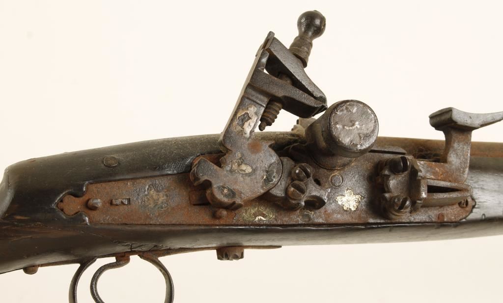 Mid-East weapon. Anywhere else and this would be a crew served weapon. Ornately decorated barrel is 59" long. Has 7 ornately engraved sheet brass barrel bands. All steel is rusted. The long lower tang of the trigger guard is broken with 6" of it missing. The fore stock is broken and about 14" of it and the ramrod are missing. One of the side plate escutcheons is missing along with its screw. The stock looks like it was cut and reattached. The buttplate is of a blonde wood and is loose. The stock was broken through the wrist and repaired. The forend is a collection of splinters. The bore is a rusty hole. The action doesn't work. Condition is poor. *Antique Firearm*