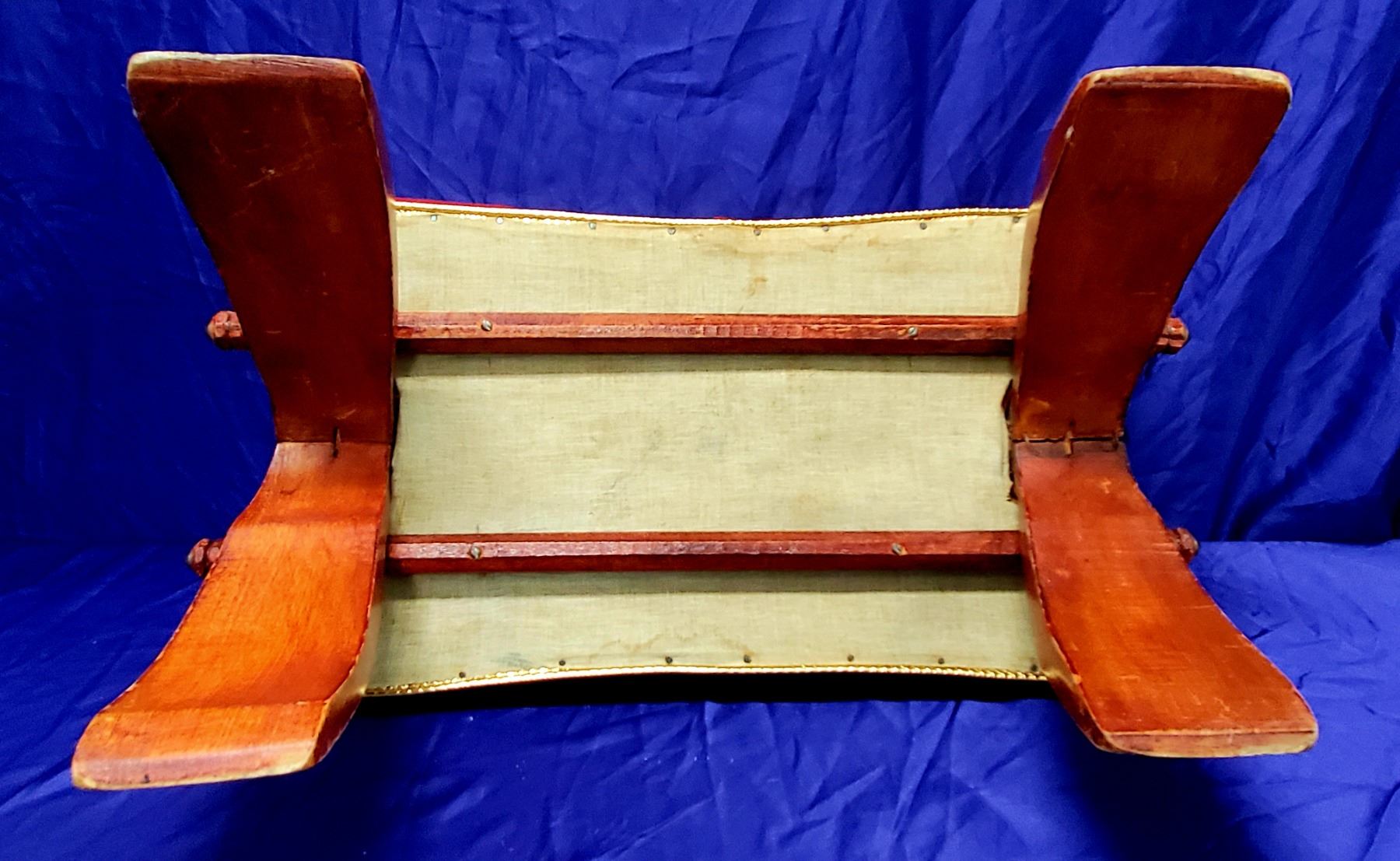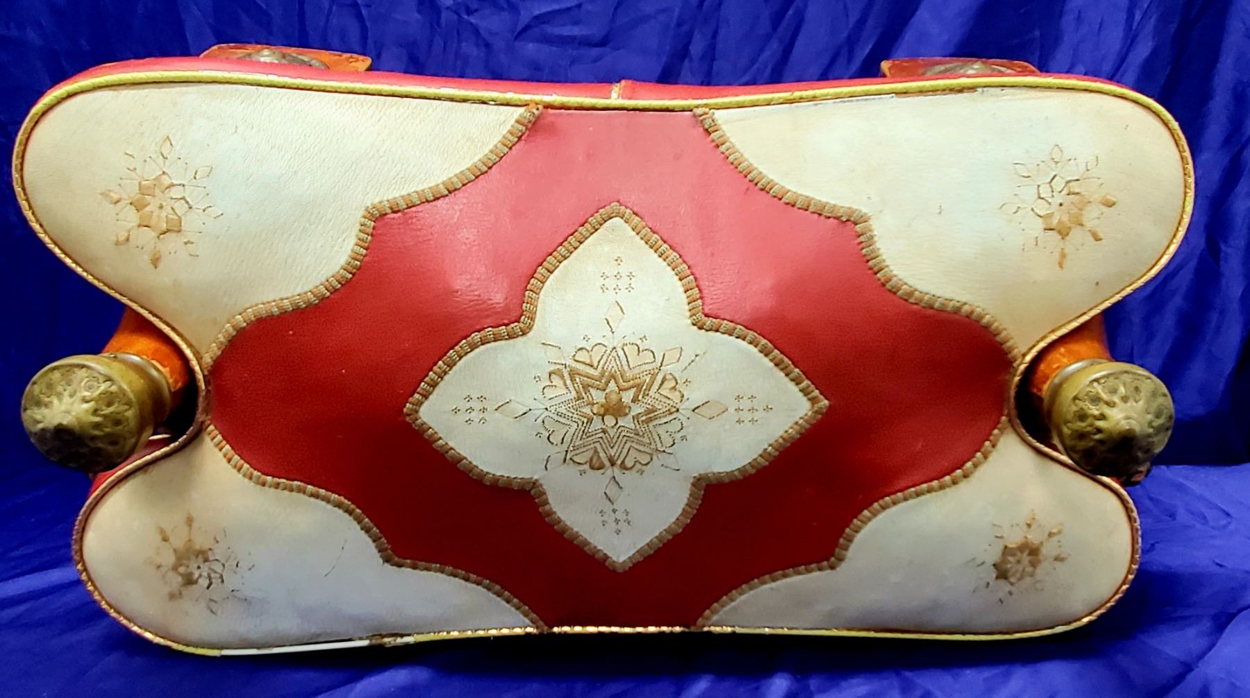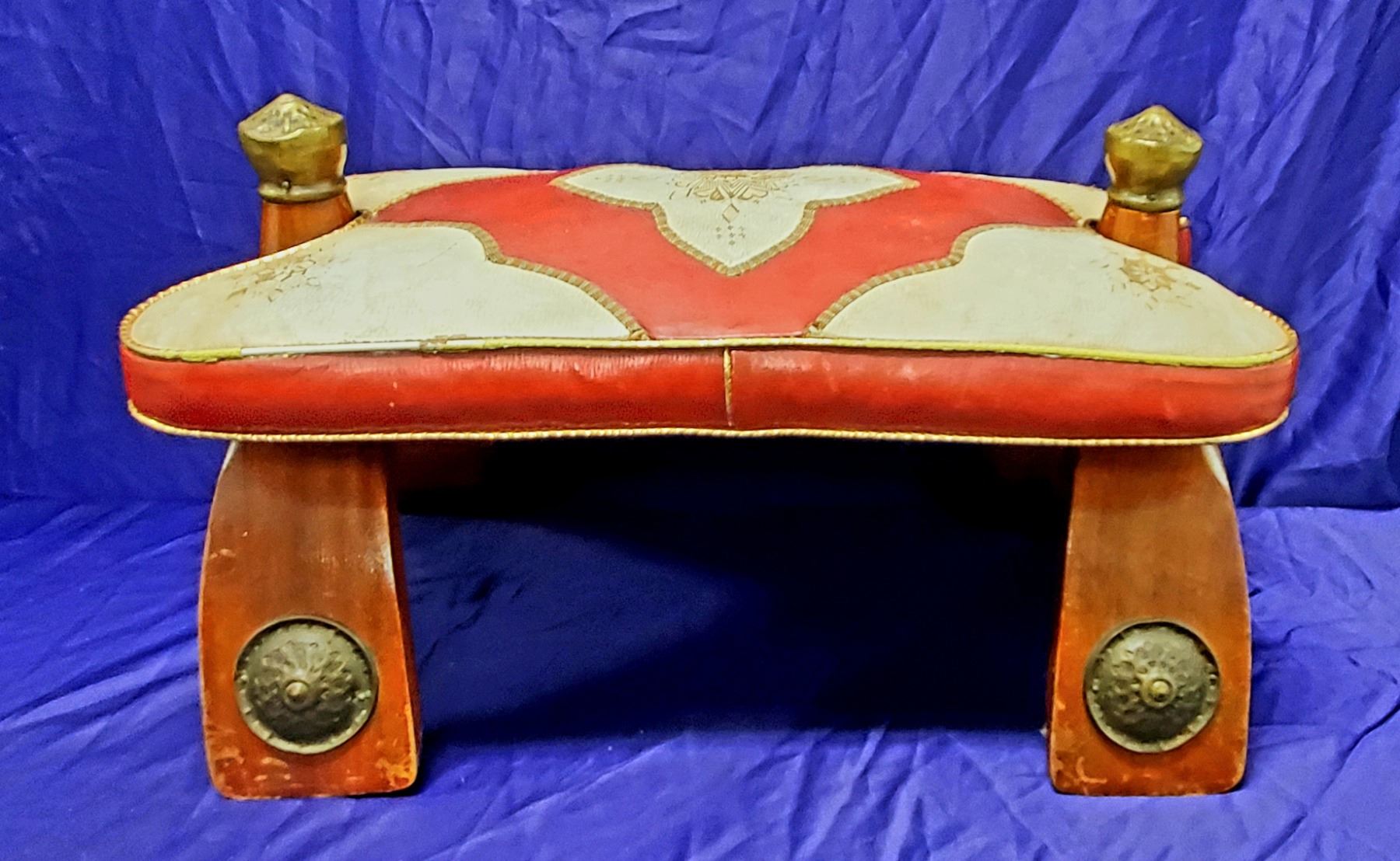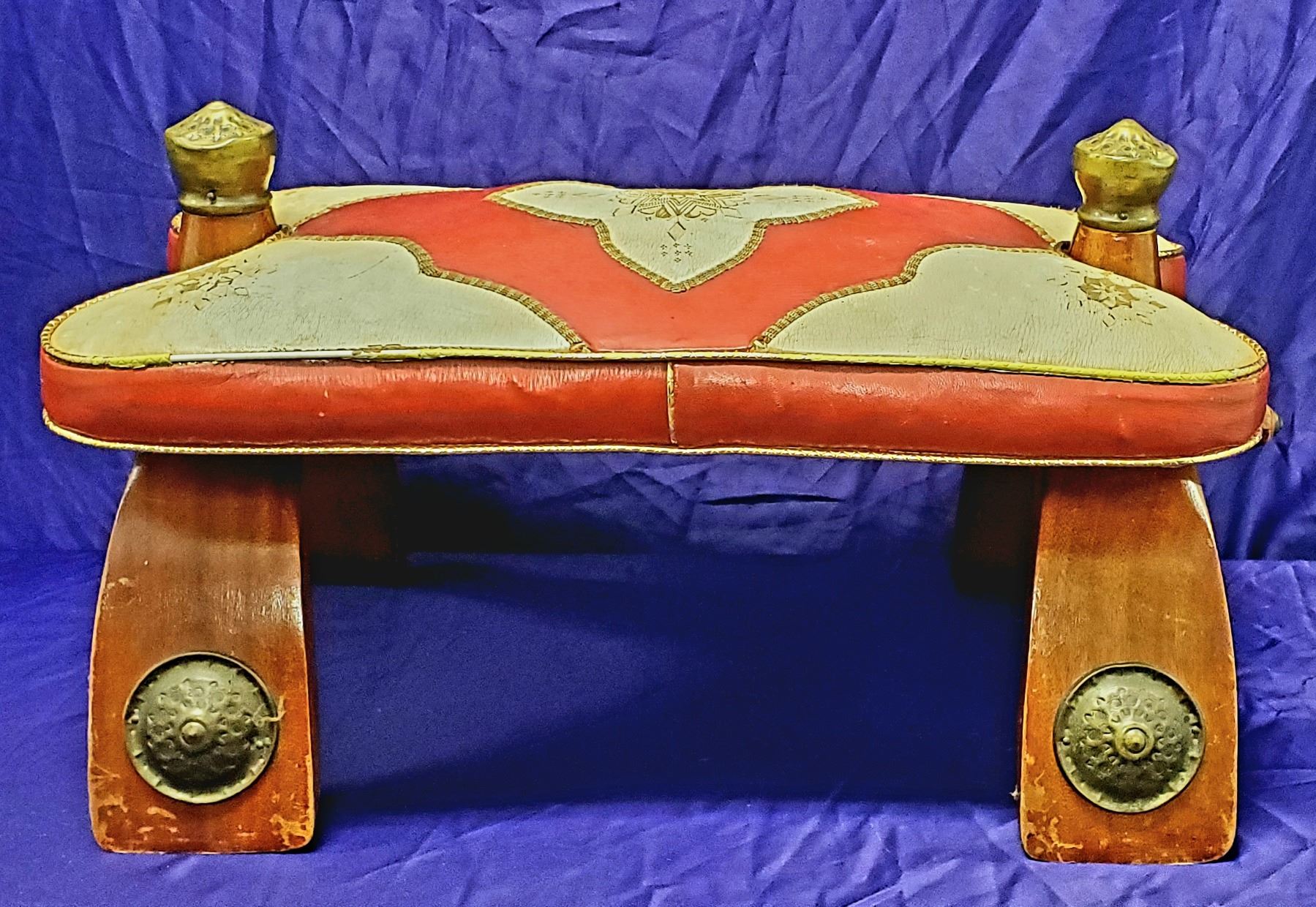 A beautiful Arab Camel Saddle Stool which is adorned with Gold Gilding, a White and Red leather seat and Metal Trim throughout. The seat is rare as it is not only multi colored that blends white and red but it also has detailed stitching. The Consigner stated that it was a Gift to her father from King Hussein which is not documented but makes for an interesting conversation starter. 14.5 inches H x 25 inches W x 13.5 inches D. In good condition.