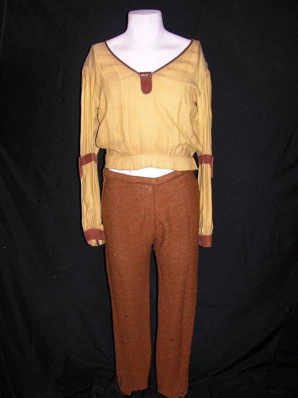 Yellow wool shirt with leather accents and matching yellow-brown pants, worn by a actor in Camelot (1967). This ensemble was worn by an actor playing one of Guinevere's entourage in the Lusty Month of May sequence of the film. Includes an original Warner Bros. label on the inner collar. Camelot told the legendary story of King Arthur in musical form.