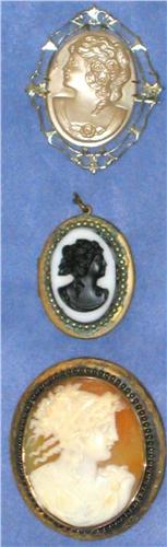 Lot: Cameos.1: 2" Shell cameo, fine execution in detail of Diana ?. Mounted in silver roped silver mount w/ hook clasp, nice age. Next is a 1.75" silver metal mounted silver stone cameo, unknown material, has old style hook clasp. Last is a suite w/ a lo