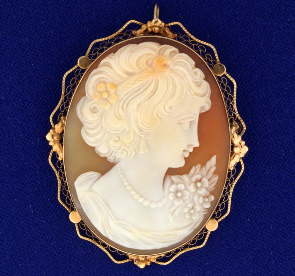 In 14k yellow gold, with beautiful detail. 2 1/4 inch long with bale. Bale folds into cameo when used as pin. 11.8g.