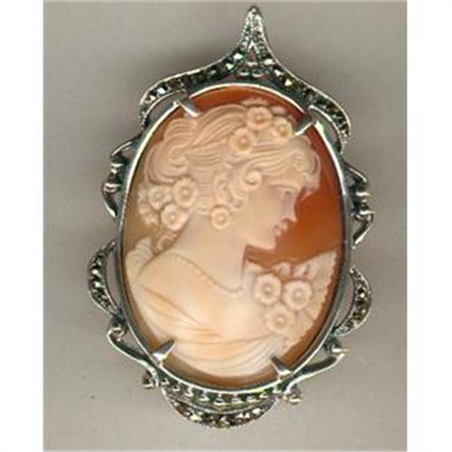 This lovely shell cameo was hand-carved in Italy and the frame is made of sterling silver with marcasite stones pave' set. Measures 40x65mm.