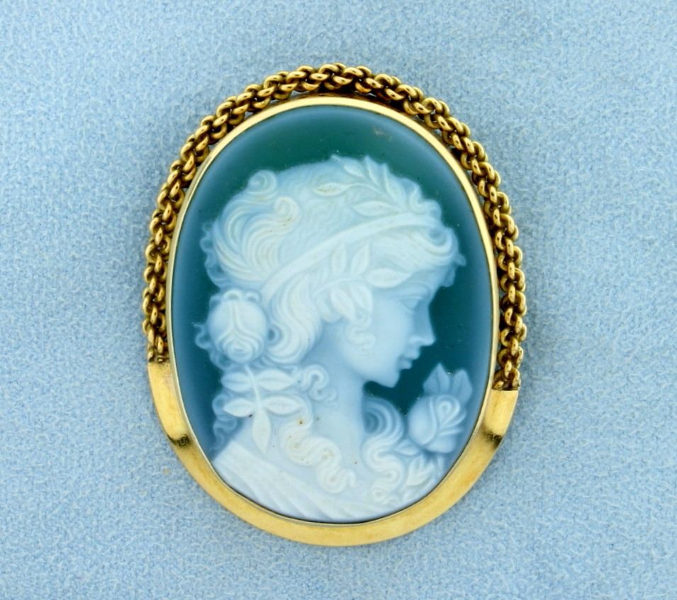 In 18K yellow gold the bale folds in to be worn as a pin and is 2 inches long. Beautiful detail of girl and roses. 17.9g