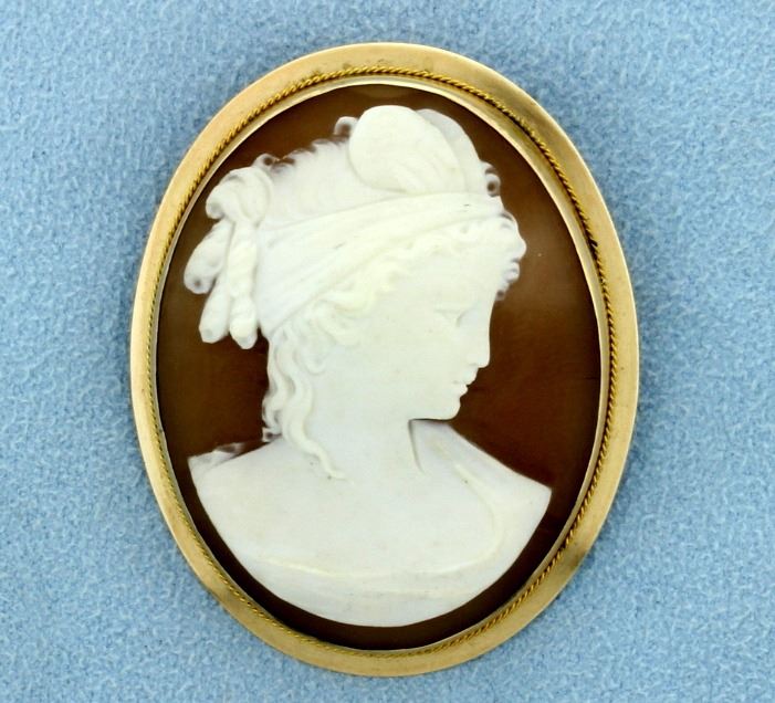 In 14K yellow gold, the pin/pendant is 1 3/4 inches long. The bale folds into cameo to be worn as a pin, great detail on cameo! 9.8g