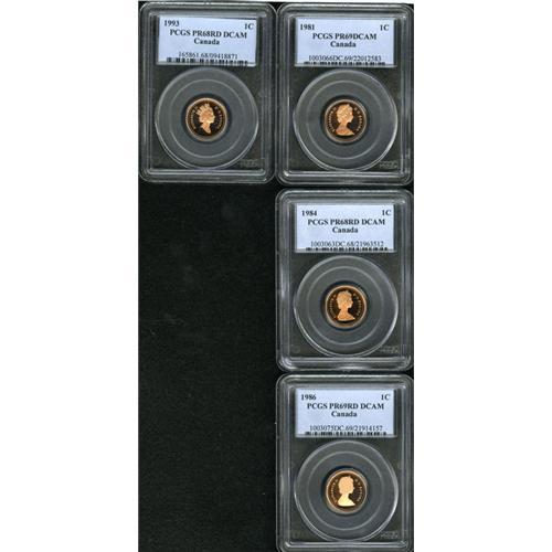 <B>Cameo Proof Cents including:</B></I> 1981, Proof 69 Deep Cameo; 1984, Proof 68 Red Deep Cameo; 1986, Proof 69 Red Deep Cameo; and a 1993, Proof 68 Red Deep Cameo. All are PCGS certified.