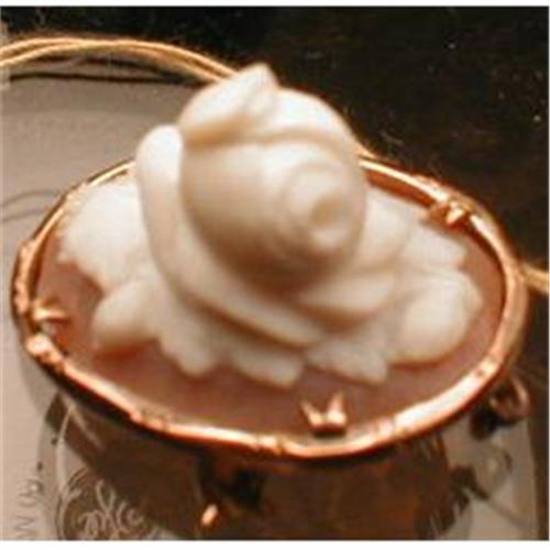 Great pin or pendant with an ultra high relief shell cameo with an unusual carved rose. The round blossom stands 1/4 inch or more from the base. This is the only floral carved cameo we