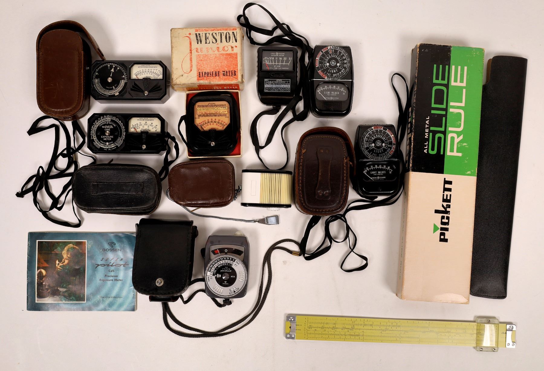 Light Meters Lot of 8. 1. Gossen Pilot Exposure Meter with case 2. Weston Photronic Exposure Meter with leather case 3. GE Exposure Meter 4. Weston Cine Exposure Meter 5. Tower Exposure Meter 6. Weston Model 850 7. GE Exposure Meter with case 8. Weston Direct Reading Exposure Meter. Bonus!!! This lot comes with a nice Pickett Slide Ruler in original box with leather ruler case!