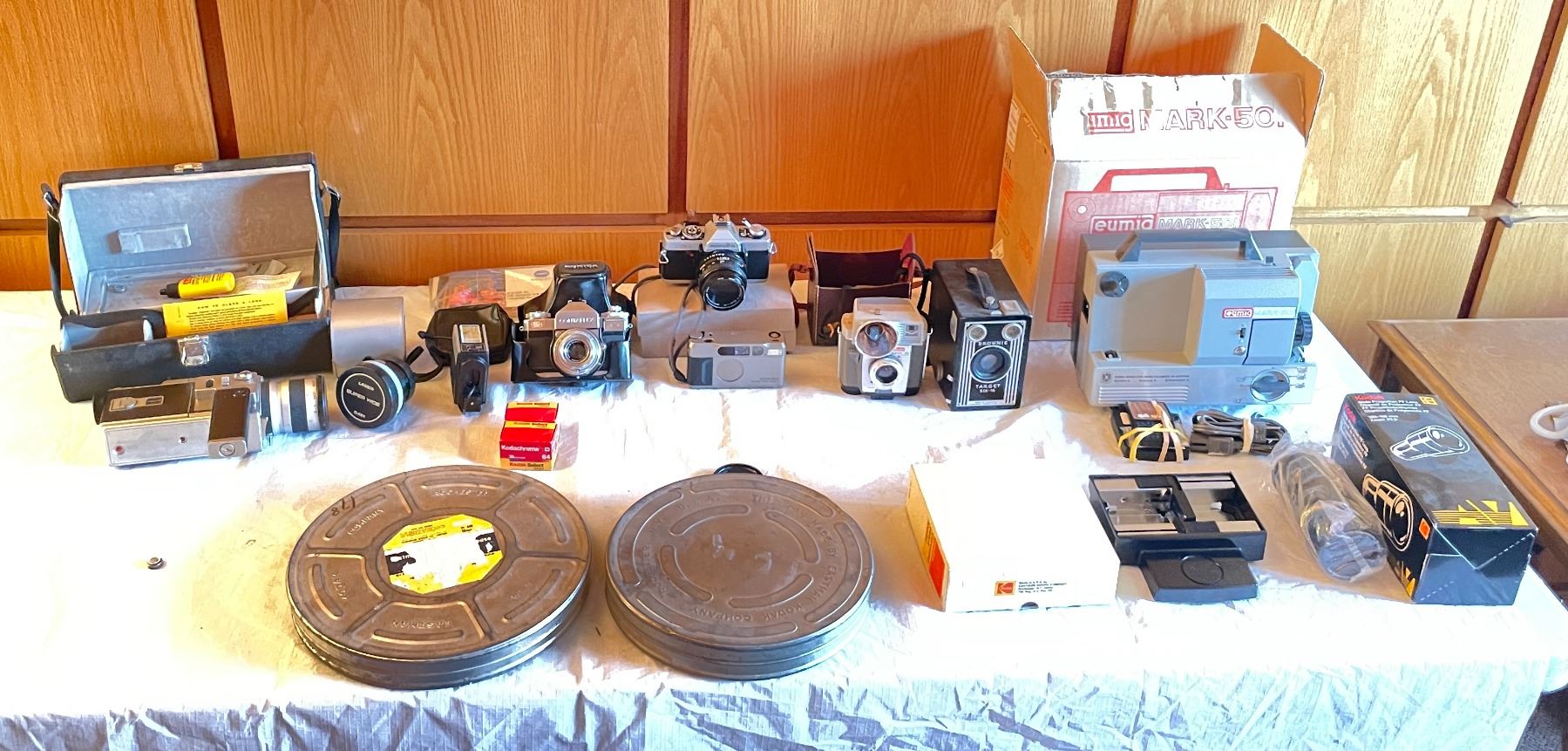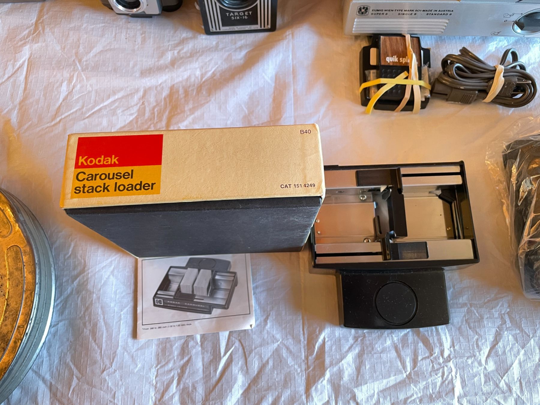 Includes Eumig Mark-501 - Kodak Slide Projector Lens - Kodak Carousel Stack Loader - Brownie Target Six-16 - Kodak Flashmite 2.0 - Contax Cart Zeiss Sonnar 2.8/38 - Minolta XG1 - Contaflex Zeiss IKON - Vivitar Auto 252 flash - Laser Super Wide 0.42x Lens - Canon Super 8 Auto Zoom 814 - 2 Kodachrome film - 2 Aluminum film reels "This can made by Eastman Kodak Company Rochester, N.Y. U.S.A"