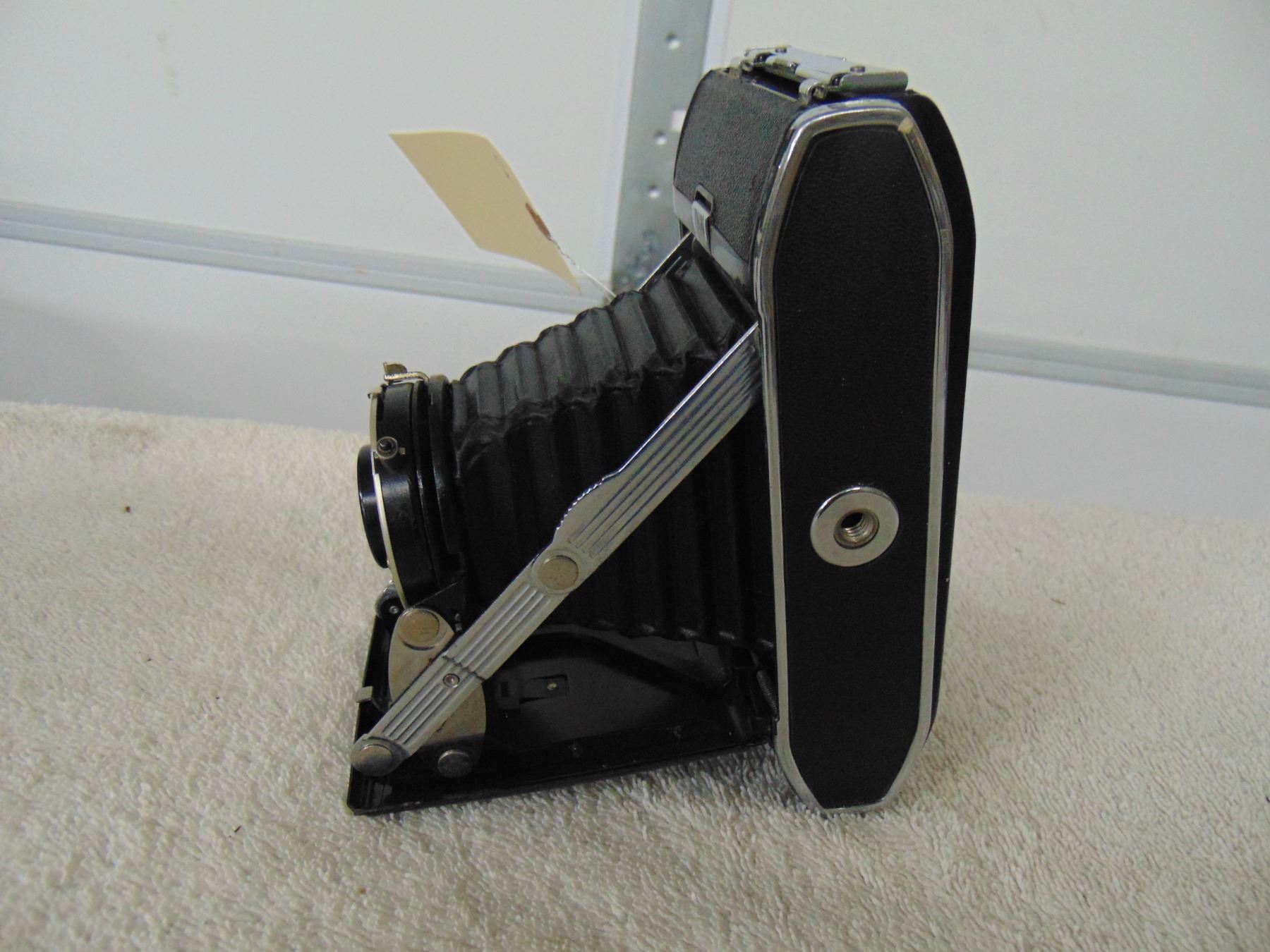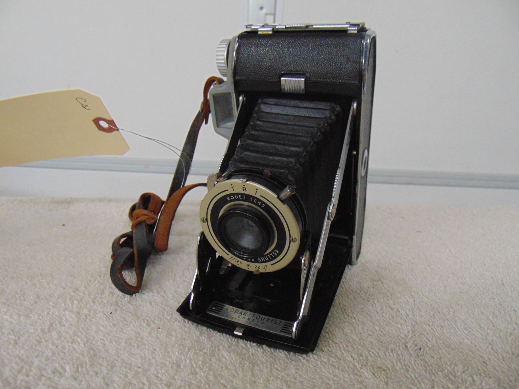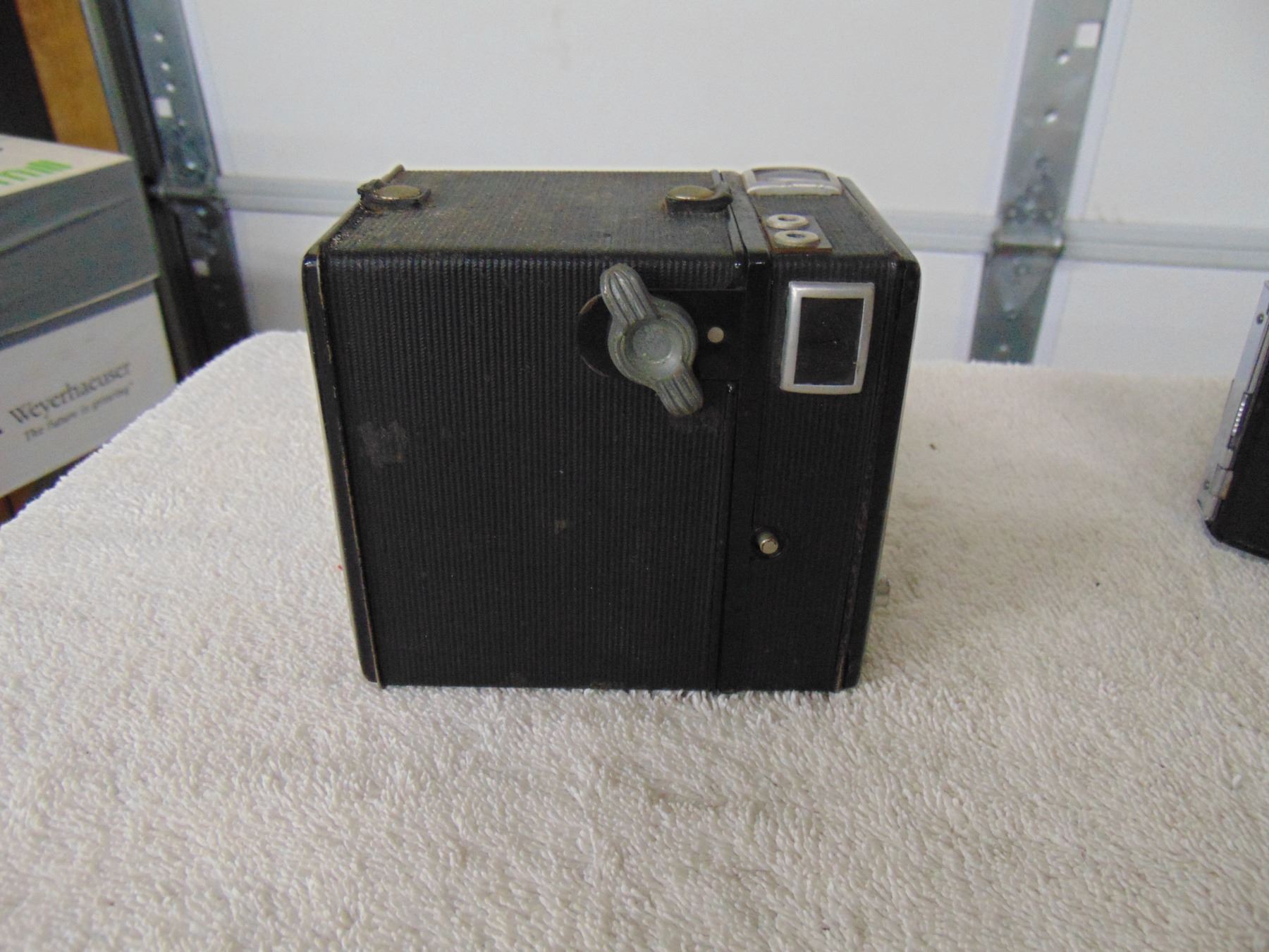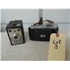 Two vintage cameras; one Kodak Tourist, bellows type; Tower model 7 box camera.
