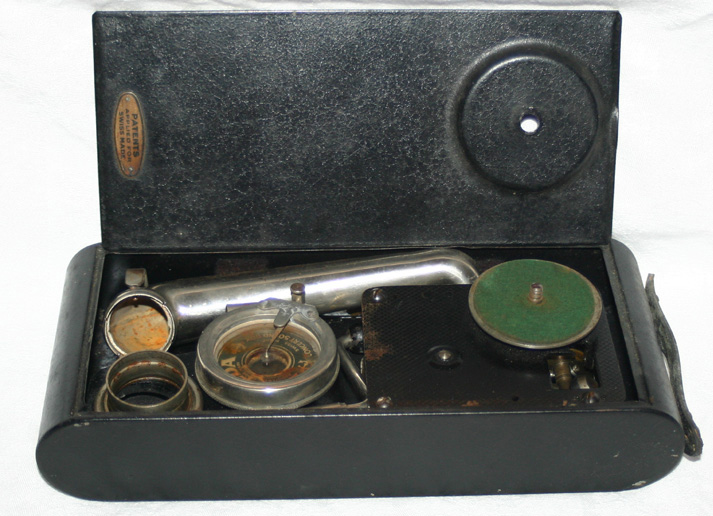 Cameraphone – Phonograph – All metal case in black. Leather handle. Small metal plate on outside of case reads Patents Applied For, Swiss Made. On reproducer is written: Excelda Registered Trademark. Swiss Made Concert Sound Box. Overall approx. measurements: 11” x 4.75” x 2.5”. Complete and in working condition.