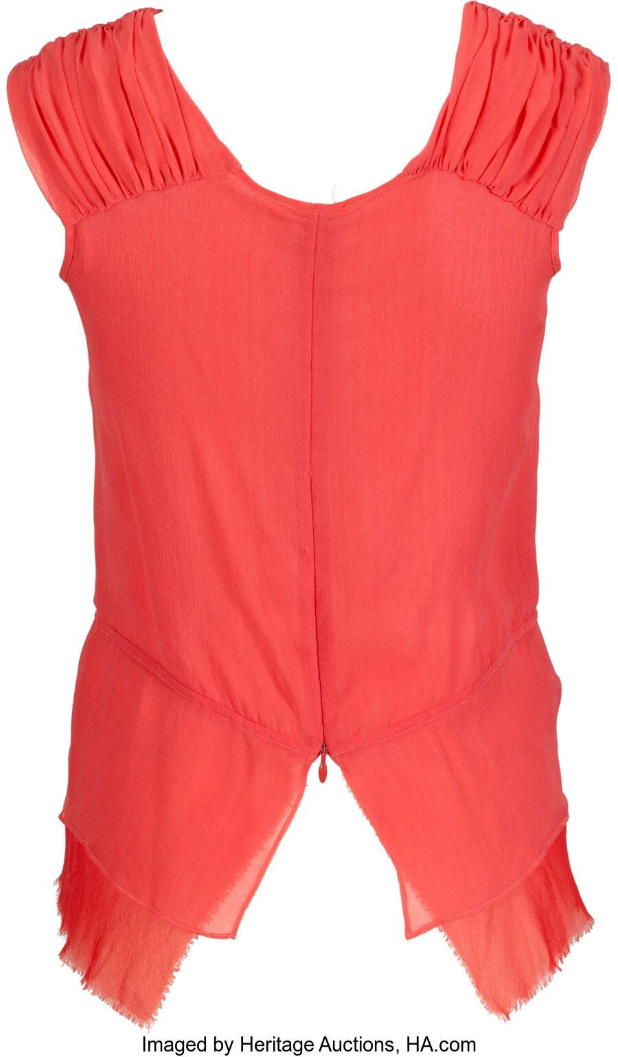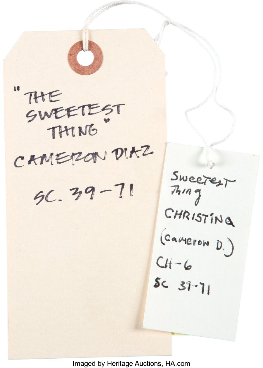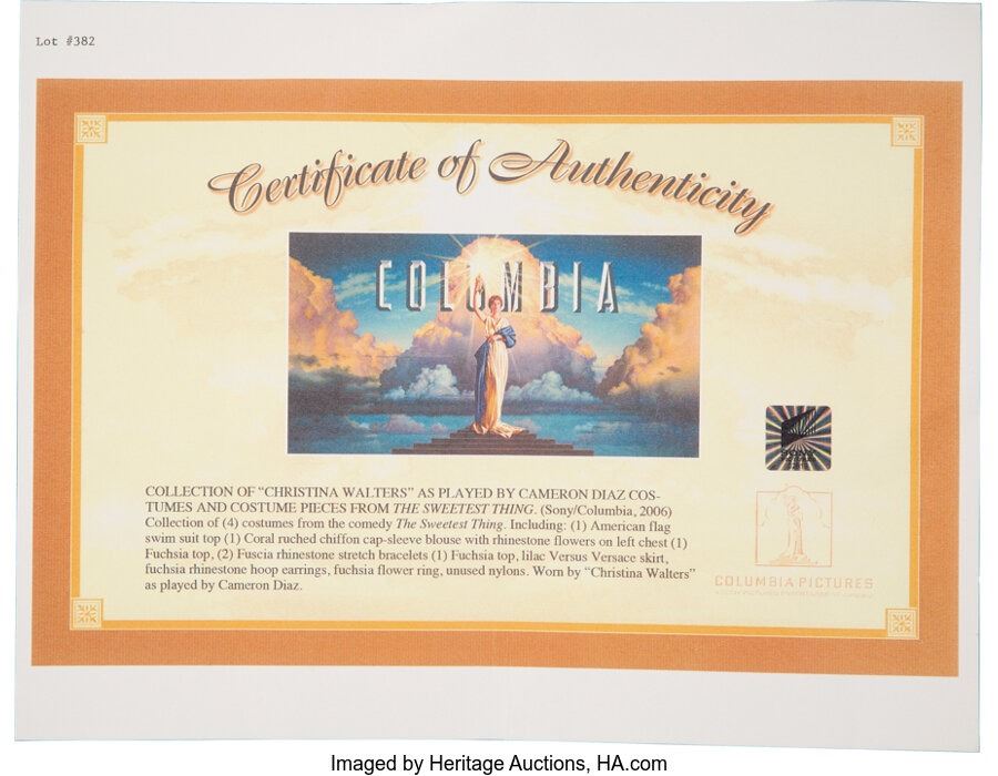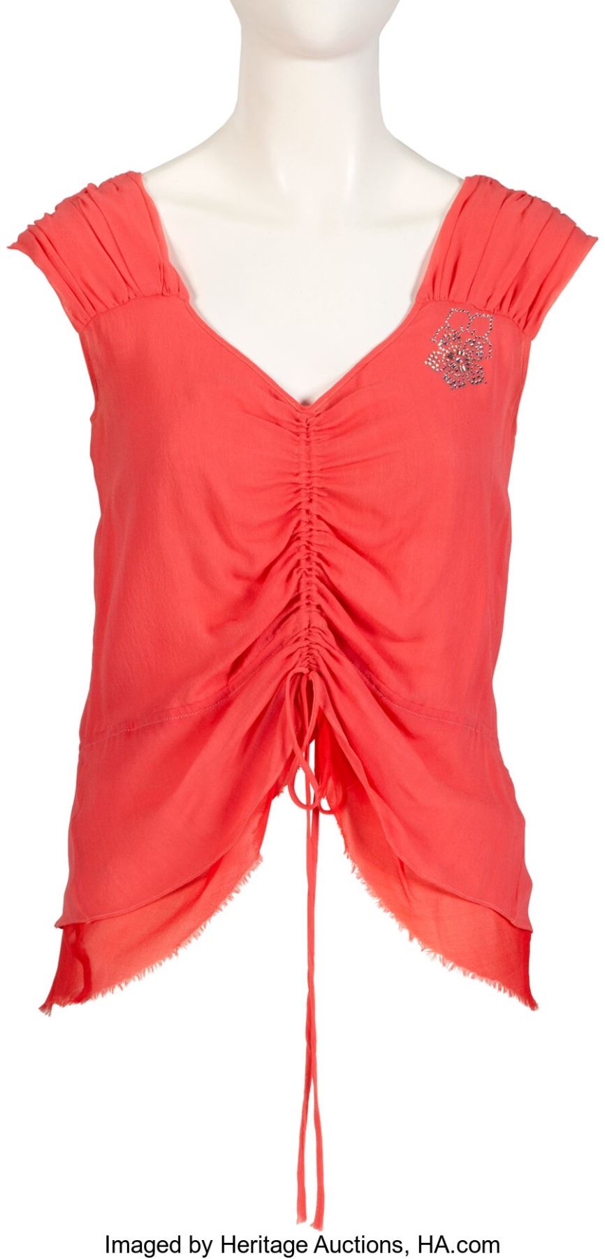 Cameron Diaz Worn Blouse FromThe Sweetest Thing(2002).A blouse worn by Cameron Diaz in the 2002 romantic comedy, The Sweetest Thing. Diaz stars in the film as Christina Walters opposite Christina Applegate. A coral two-layered ruched chiffon cap-sleeve blouse with rhinestone flowers on left chest and zipper down the back. No size, though 16" shoulder-to-shoulder. Original costume tag intact. Fine condition. With a copy of the COA from Columbia Pictures, describing the top in detail. COA from Heritage Auctions.