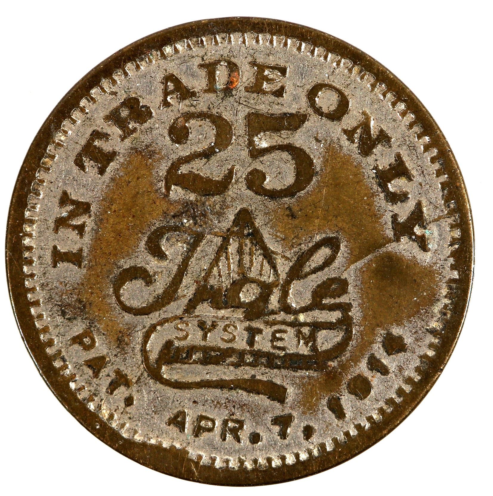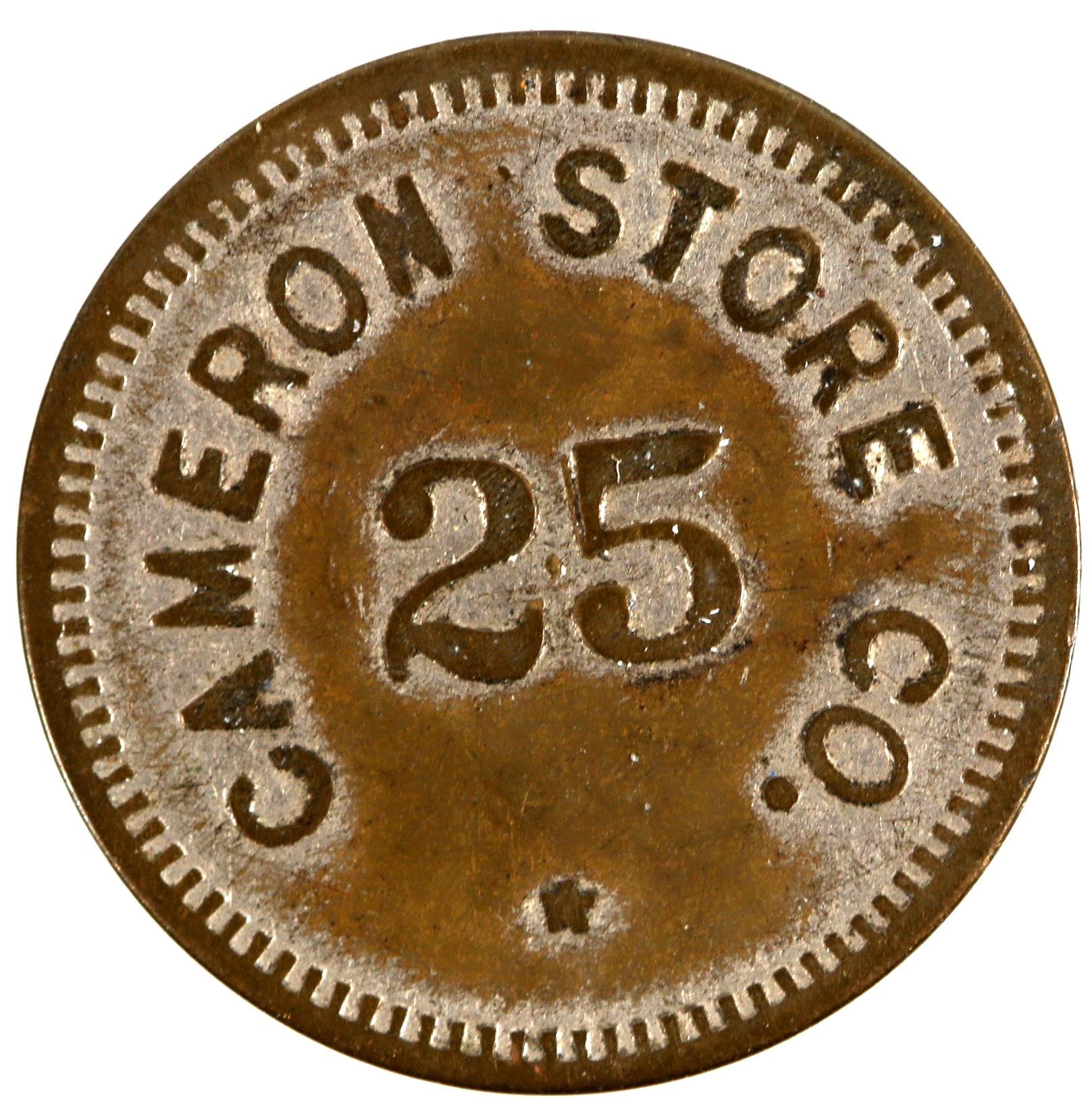 CAMERON STORE CO. / 25 // IN TRADE ONLY / 25 / INGLE / SYSTEM / PAT. APR. 7, 1914; NpB, rd., 24 mm. From tokencatalog.com: "Ingle Customer Ledger: Cameron Store Co., order #3792 shipped about 1917 to New House Building (sic), Salt Lake City, UT. The corporate headquarters for the Cameron Coal Co. was located in the Newhouse Building. The Cameron Store Co. was incorporated November 12, 1914 in Salt Lake City. Frank Cameron had a mine & camp at the junction of the Bear River and Price River canyons beginning in 1913. This became the town of Cameron. In 1917 Cameron sold his interest in the mine to Henry Rolapp, and the town name soon changed to Rolapp."