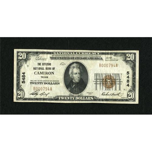<B>Cameron, TX</B></I> - $20 1929 Ty. 1 <B>The Citizens NB</B></I> Ch. # 5484<BR> Notes from this bank are more often seen than are those from the other two banks in town, but none can be considered common. This problem-free <B>Very Fine</B></I> is signed by Phillip Reid and Oxsheer Smith.<BR><BR><b>Shipping:</b> Coins & Currency (<a target="_blank" href="http://www.heritageauctions.com/common/shipping.php">view shipping information</a>)