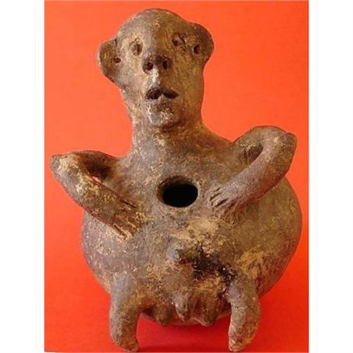 An African terracotta medicine pot from Cameroon with a charmingly rendered figure and face. Height: 9 inches (23cm), Width: 7 inches (18cm). From a renowned and published New York collection.