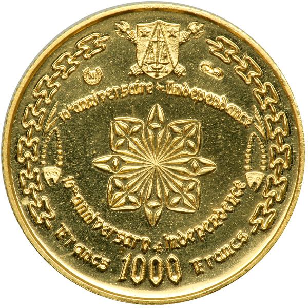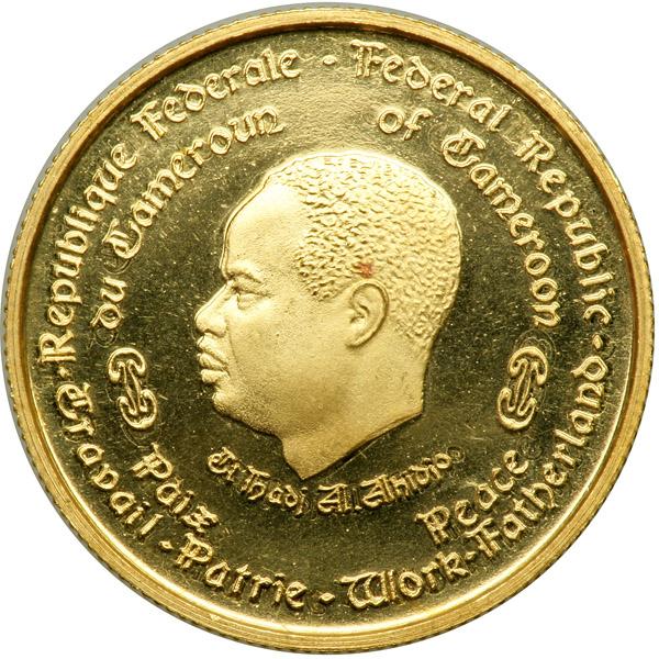 Cameroons. 1000 Francs, 1970. Fr-5; KM-18. Weight 0.1013 ounce. Mintage 4,000. Head of President Ahidjo. Tenth Anniversary of Independence. Choice Brilliant Proof.