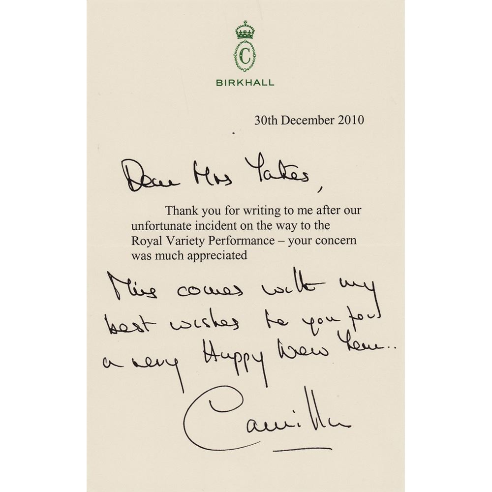 TLS signed “Camilla,” one page, 4.75 x 7.25, Birkhall letterhead, December 30, 2010. Handwritten letter to Sheila Yates, in full: "Thank you for writing to me after our unfortunate incident on the way to the Royal Variety Performance—your concern was much appreciated." Camilla adds the valediction and a postscript in her own hand: "This comes with my best wishes to you for a very Happy New Year." In very fine condition. Accompanied by the original mailing envelope.