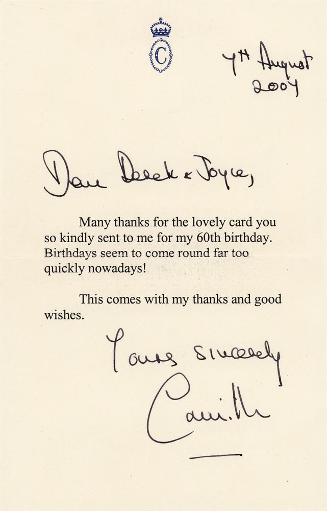 TLS signed "Yours sincerely, Camilla," one page, 4.75 x 7.25, personal letterhead, August 7, 2004. Letter to Derek and Joyce Townsend, in full: "Many thanks for the lovely card you so kindly sent to me for my 60th birthday. Birthdays seem to come round far too quickly nowadays! This comes with my thanks and good wishes." Camilla adds the date and salutation in her own hand. In very fine condition. Accompanied by the original mailing envelope.