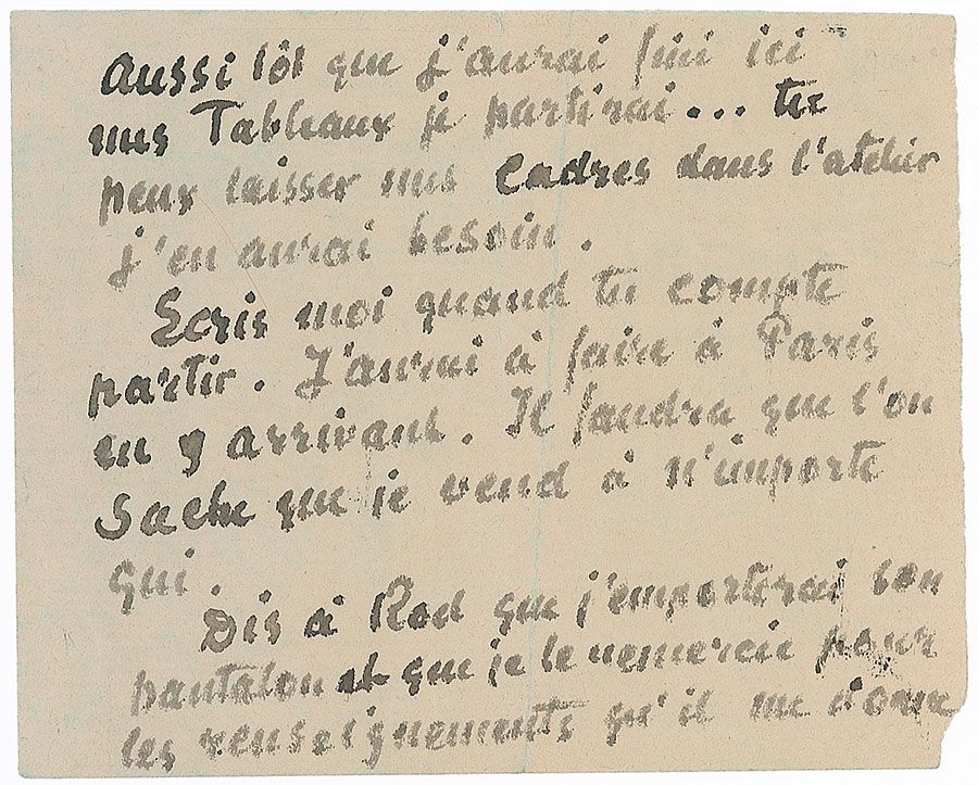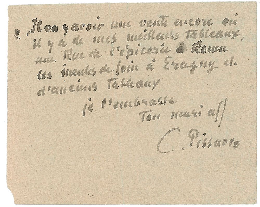 ALS in French, signed “C. Pissarro,” one page both sides, 4.5 x 3.5, no date. Letter to his wife. In full (translated): “As soon as I’ve finished my pictures here I’ll go away…You can leave my frames in the studio. I’m going to need them. Write me when you plan to leave. I have things to do in Paris when I get there. People will have to learn that I don’t sell to just anybody. Tell Ruel [Paul Durand-Ruel, Pissarro’s principal dealer] that I’ll take along his pants [possibly a reference to Pissarro’s painting ‘L’enfant au pantalon bleu (Child in Blue Pants)’ and that I thank him for the information he gives me. There’s going to be a sale again where there’ll be some of my best pictures, ‘Rue de l’é-picerie a Rouen [Street in Rouen with a Grocery Story]’ and ‘Les Meules de Foin a Eragny [Haystacks at Eragny]’ and some old pictures.” In fine condition, with a central vertical fold and a missing lower corner tip.