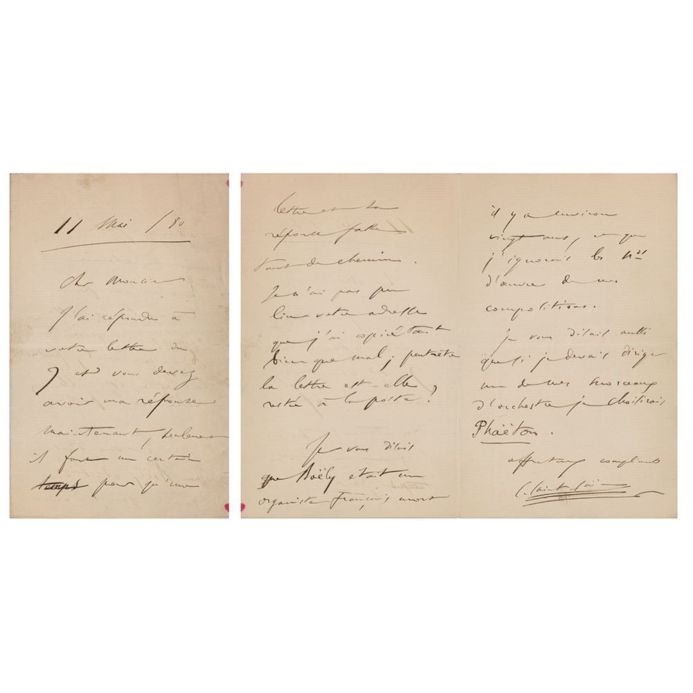 Remarkable collection of 16 ALSs in French from esteemed composer Camille Saint-Saens, signed “C. Saint-Saens†or “C. St. S.,†totaling 40 handwritten pages, dating between 1880 and 1919 (three letters undated), a span of nearly four decades that covers his emergence as an international figure to the very twilight of his career as a stalwart defender of the French tradition. Selected passages are as follows (partially translated):