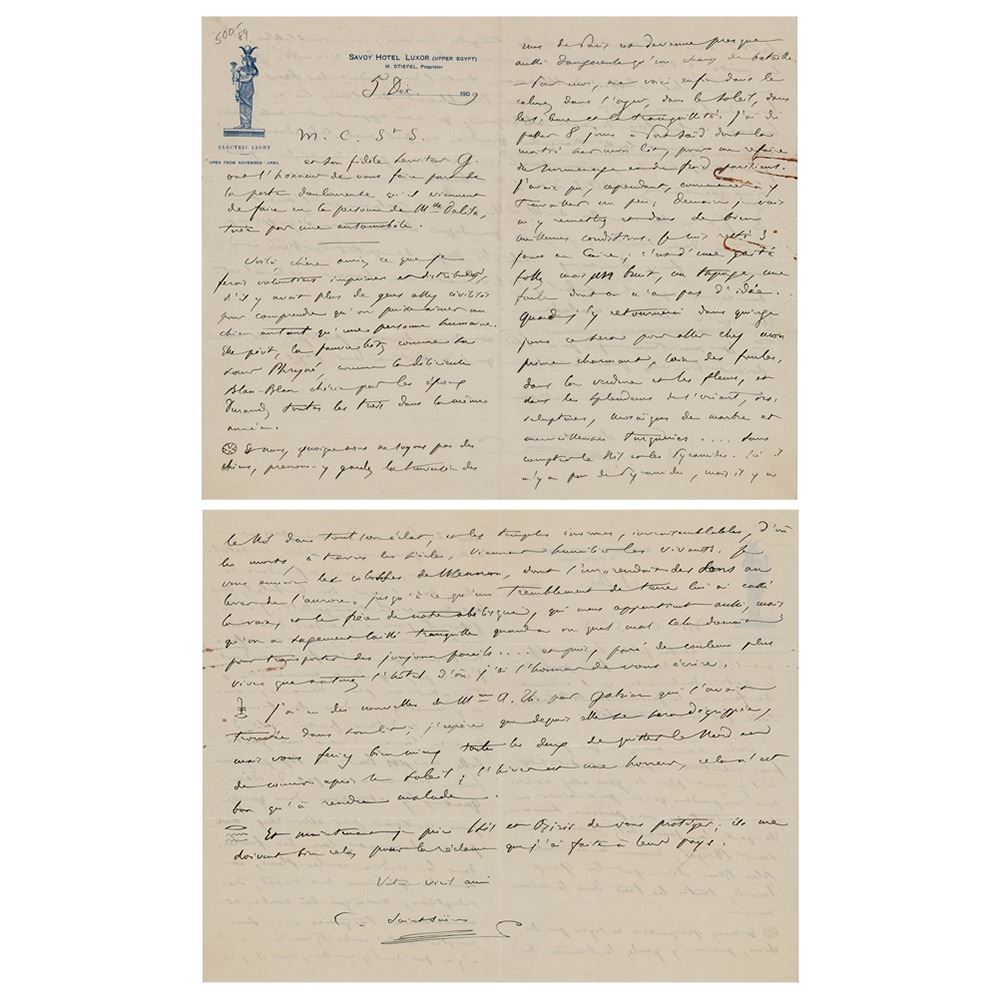 No date: addressed from Weimar and reporting that he has mislaid a letter sent to him and asking his friend to remind him what he still owes Wieniawsky (perhaps Polish composer and violinist Henri Wieniawsky). Includes a photo of Saint-Saens with his friend Sir Henry Heymon, taken in June 1915. In overall fine condition.