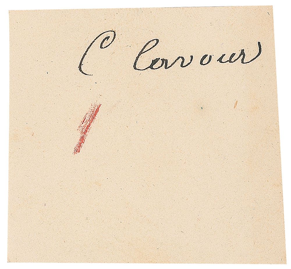 Leading figure in the movement toward Italian unification (1810–1861), who then served as the country’s first prime minister. Ink signature, “C. Cavour,” on an off-white 2 x 2 clipped slip. In fine condition, with a red pencil mark below the signature.