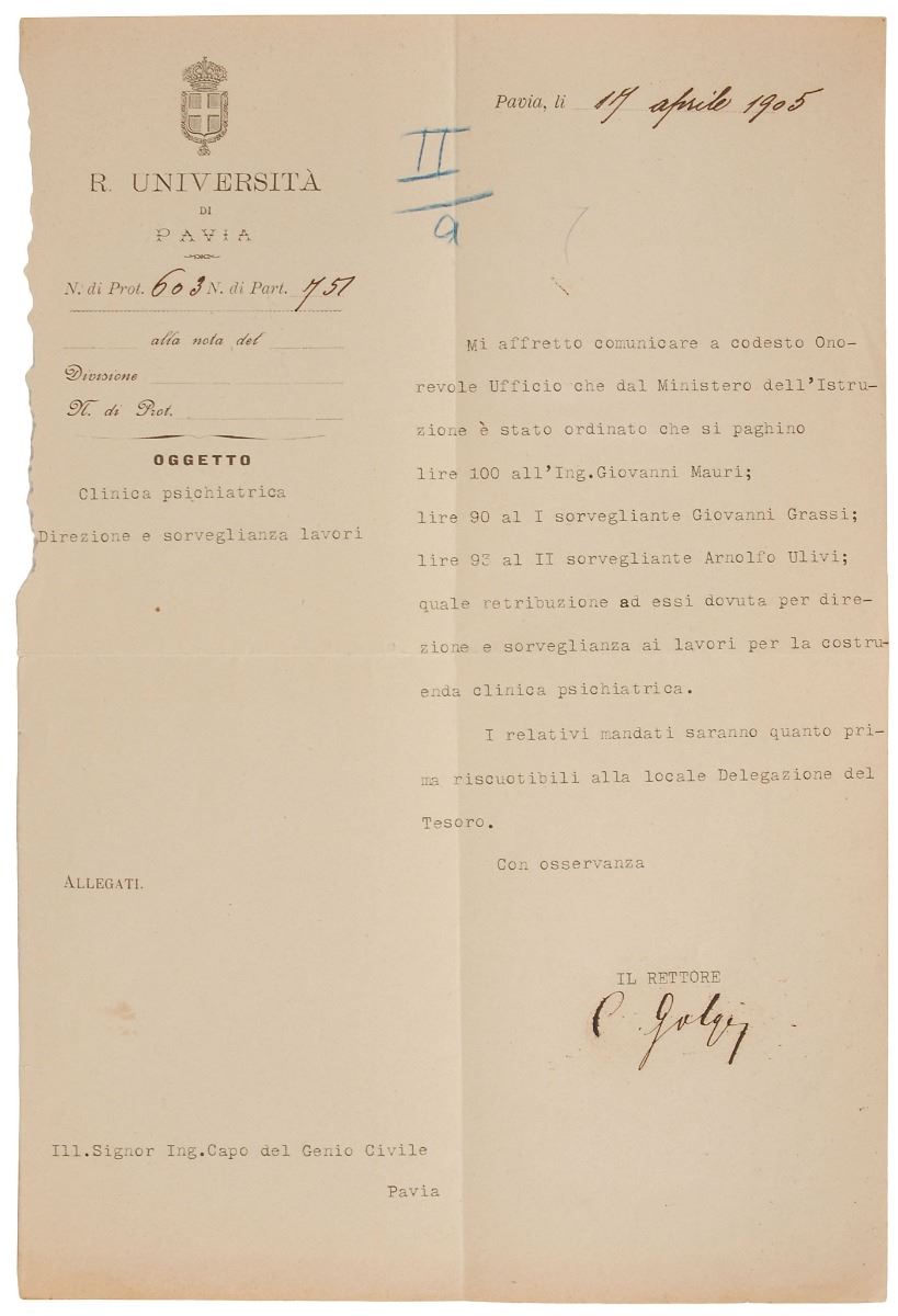 Italian physician, pathologist, and scientist (1843–1926) who won the Nobel Prize for Medicine in 1906. DS in Italian, signed “C. Golgi,” one page, 8.25 x 12, April 17, 1905. Document from the University of Pavia concerning payment of workers for their supervision of the construction of a psychiatric clinic. In fine condition, with a rough upper left edge. Pre-certified PSA/DNA.
