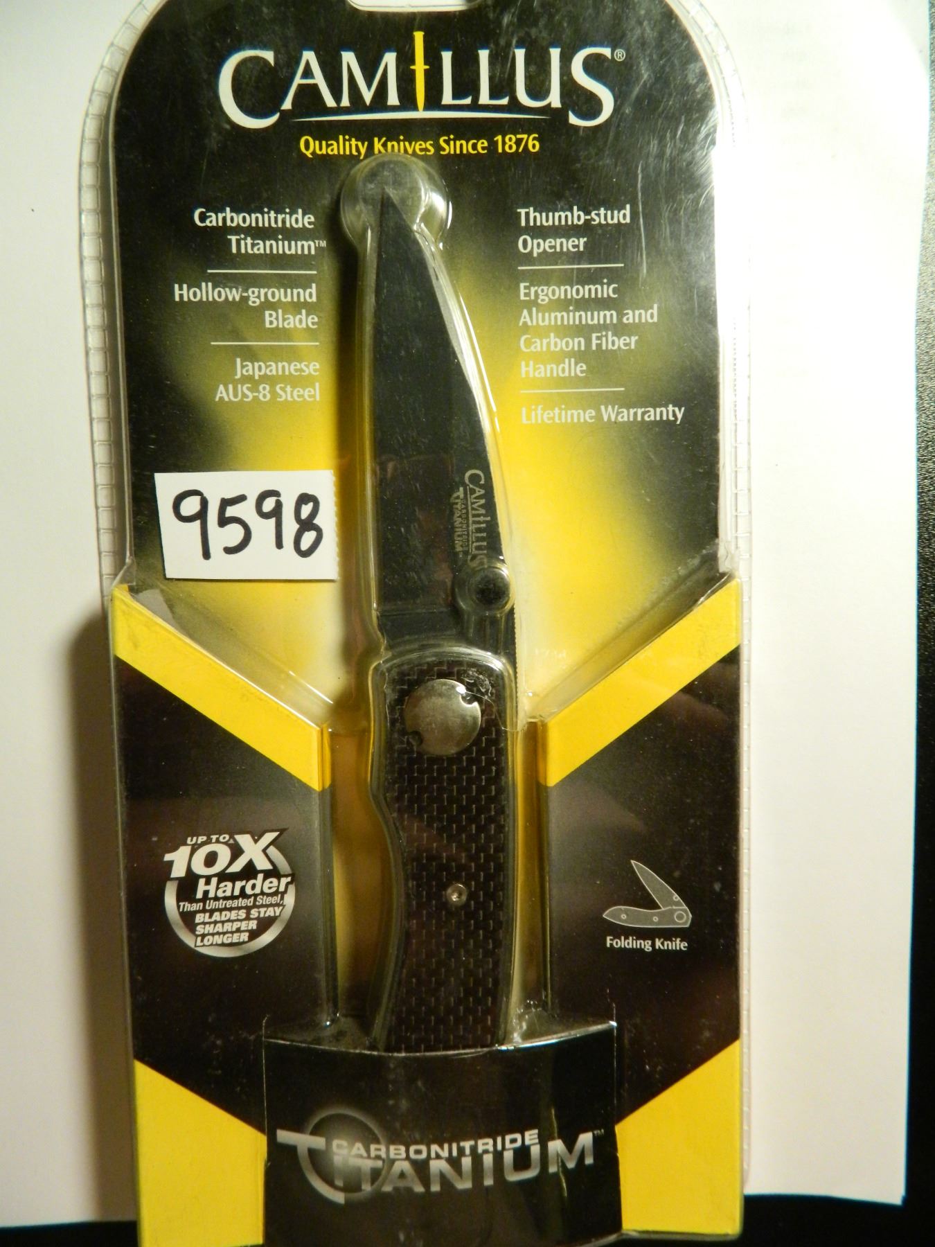 Titan Linerlock - 4 1/2" closed. 3 1/4" Carbonitride Titanium Japanese AUS-8 stainless hollow ground blade with thumb stud. Black carbon fiber handles