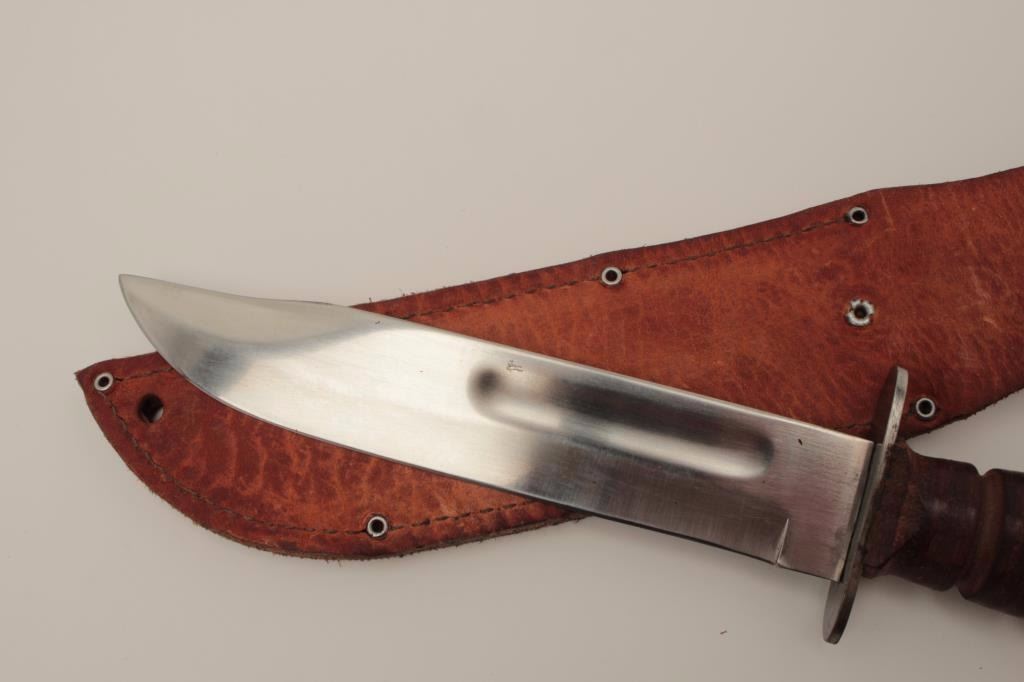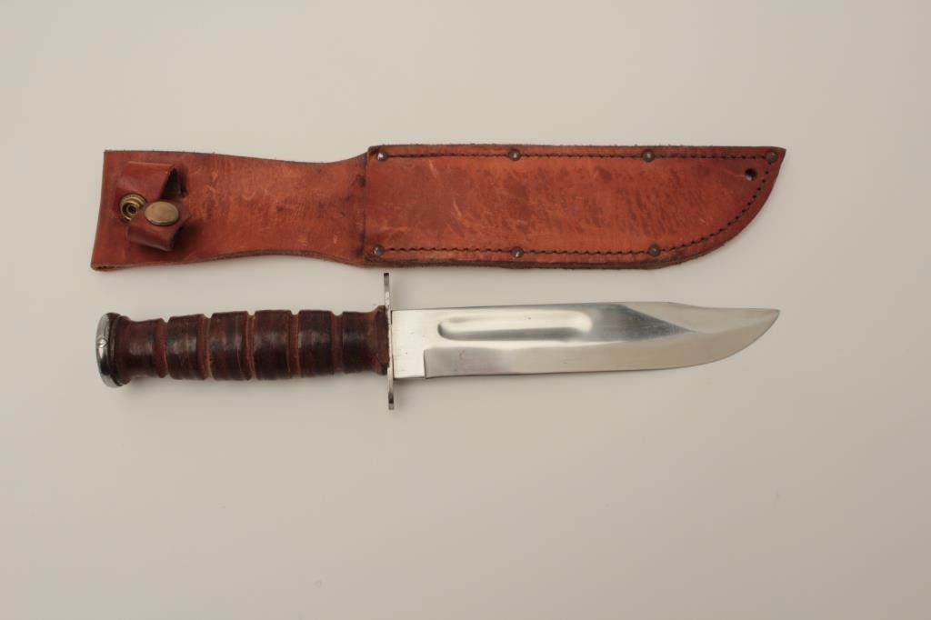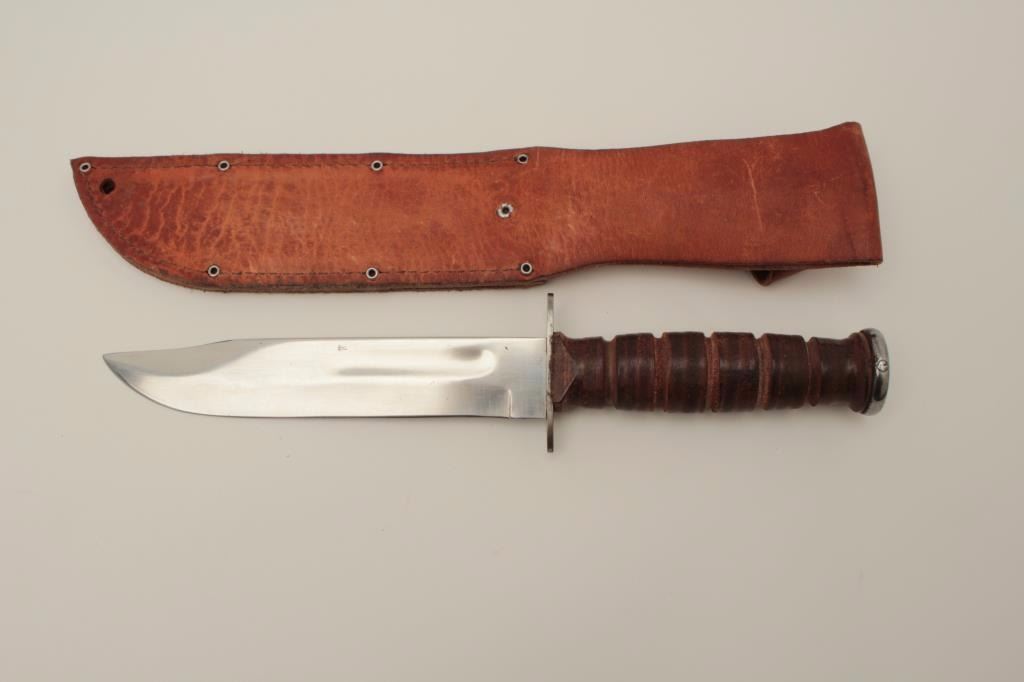Camillus U.S. issue knife (MK2) with scabbard. The blade has been re-polished and the grip is near fine. Post 1962. The scabbard is very good plus. Vietnam era. Est.: $100-$200