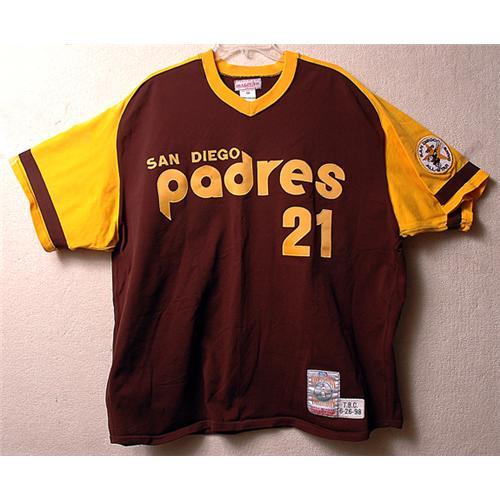 <Our item number 140177><B>Caminiti, Ken - 1998 San Diego Padres Game-Worn Jersey.</B> (1963-2004) Pull-over knit jersey by Mitchell and Ness. The front has "San Diego Padres" and the number "21"; the back has the name "Caminiti" and the number "21"; names and numbers are in single tackle twill. The manufacturer's tag is on the outside tail, the size tag is in the collar and the year I.D. is on a strip tagged on the tail. A patch on the left sleeve has "1978 ASG." Caminiti played third base for San Diego 1995-98 and wore #21 in 1998. The jersey shows light wear. A Letter of Opinion from Memorabilia Evaluation and Research Services, signed by Troy Kinunen and Dave Bushing, comes with the jersey. Caminiti died on 10 October 2004 from a heart attack brought on by a drug overdose. <BR>Estimated Value $300 - 500. <BR><BR>Our item number 140177<BR><IMAGES><P ALIGN="CENTER"><IMG SRC="http://www.goldbergcoins.net/liveauction/49jpegs/140177.jpg"> </P></IMAGES>