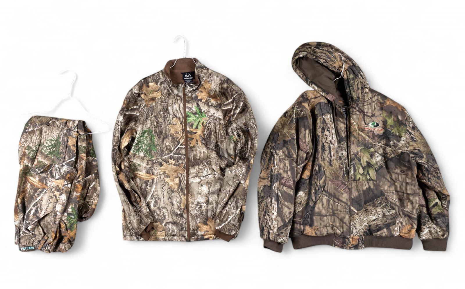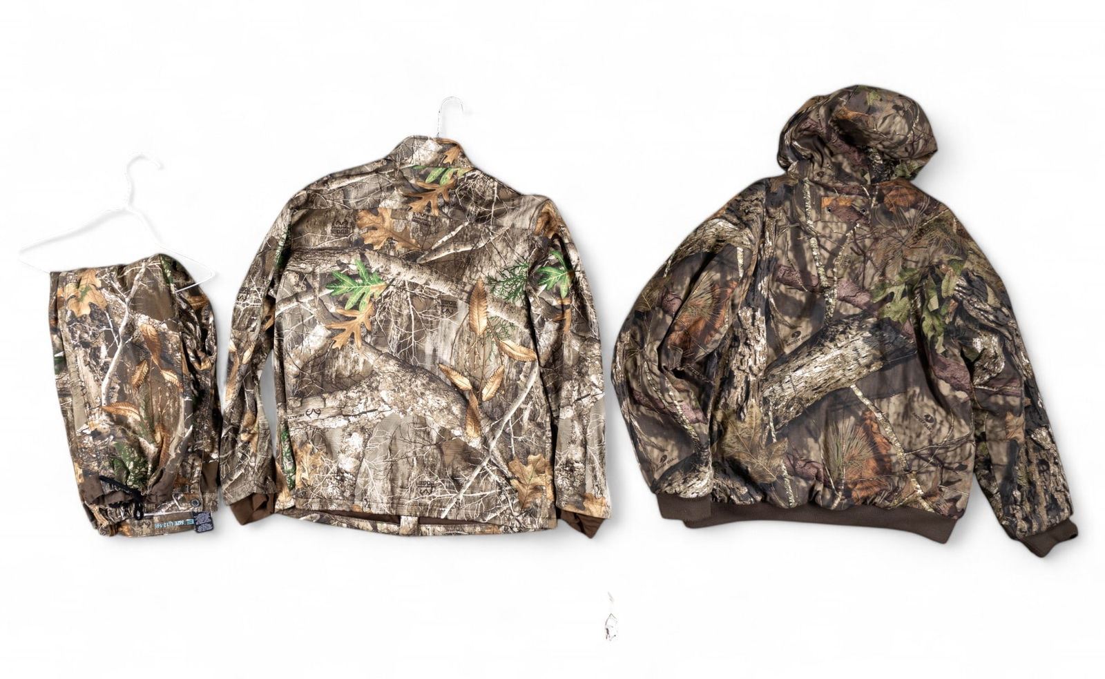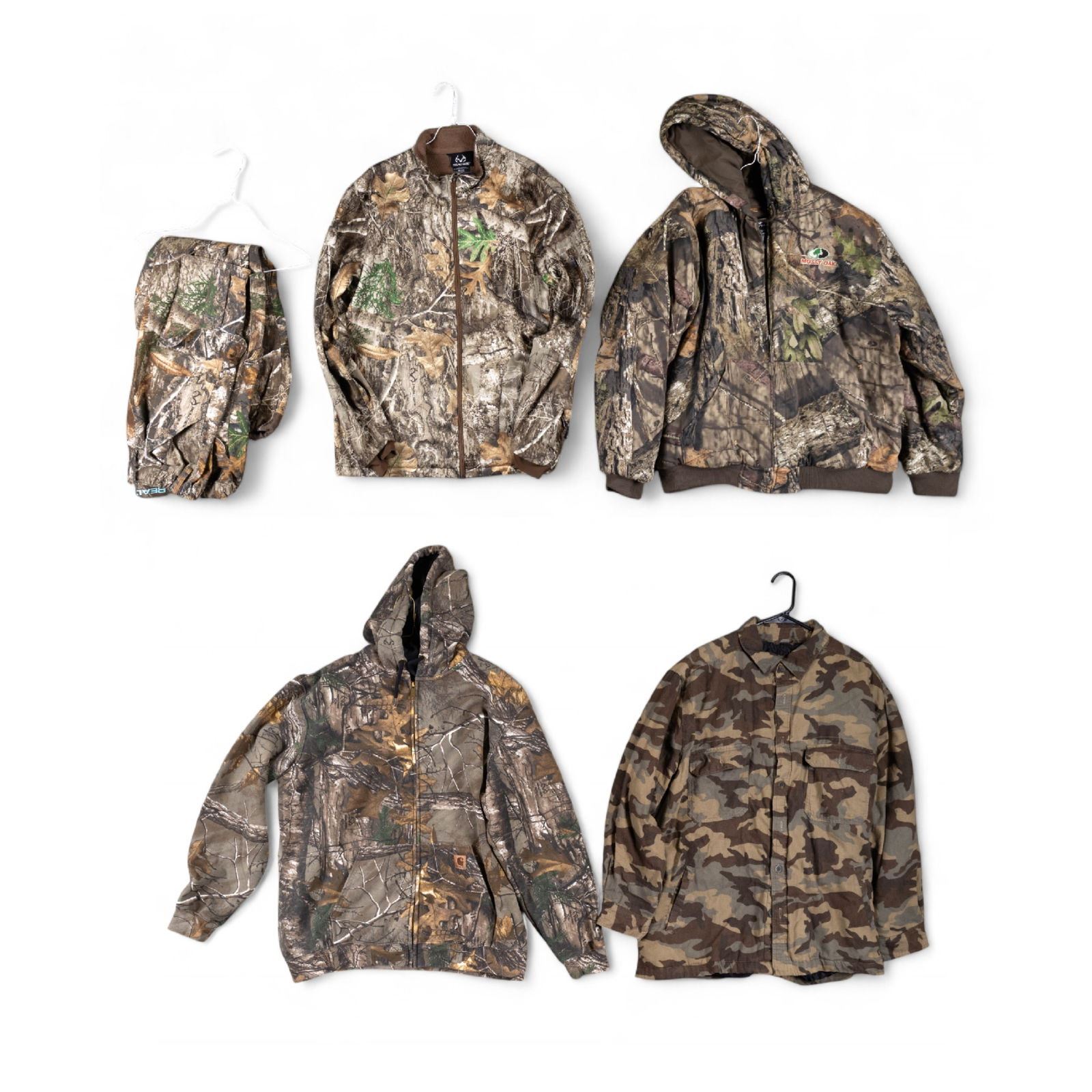 Mossy Oak feece lined zip up hooded jacket, Realtree light jacket, Realtree cargo pants, Carhart Realtree pattern zip up hoodie, and Basic Editions insulated flannel. Pants size L and jackets size XL.