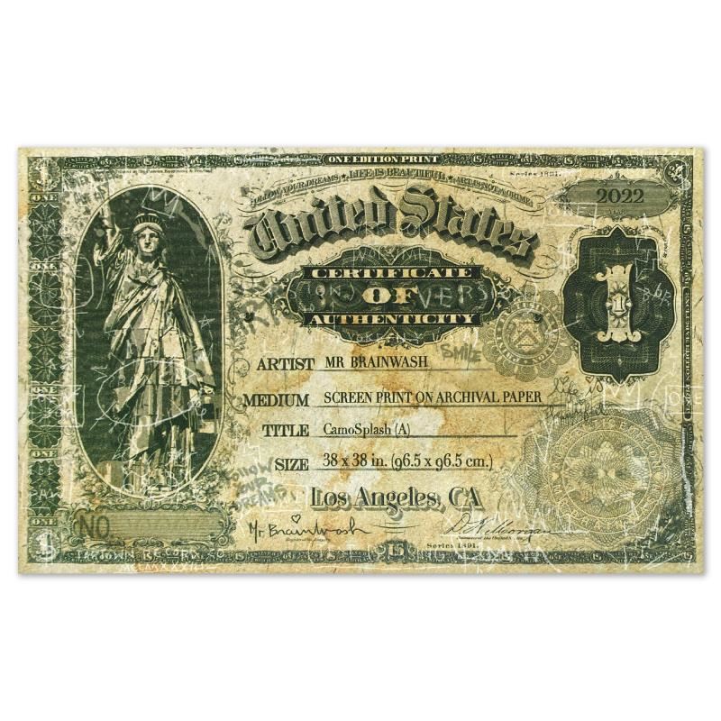 "Camo Splash A" is a limited edition silk screen print on paper by Mr Brainwash, hand signed and thumb-printed by the artist. The piece comes custom framed with a Certificate of Authenticity. Measures approx. 42" x 42" (framed), 38" x 38" (image). This item requires special handling and may have a longer than usual turnaround.
