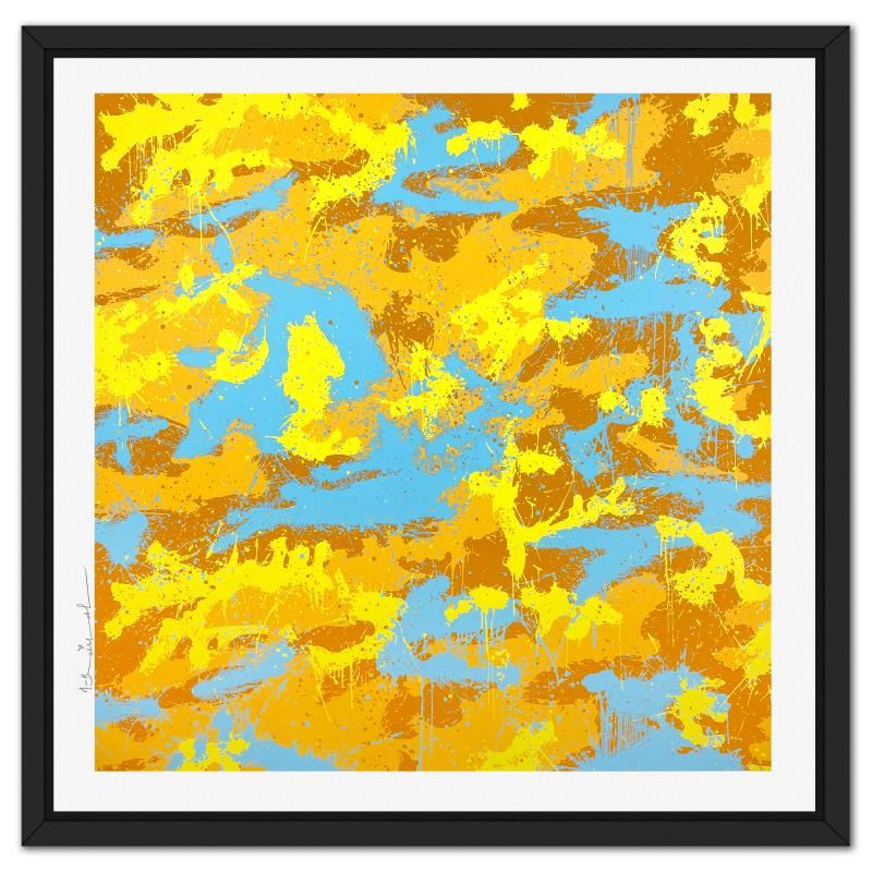 "Camo Splash B" is a limited edition silk screen print on paper by Mr Brainwash hand signed and thumb-printed by the artist. The piece comes custom framed with a Certificate of Authenticity. Measures approx. 42" x 42" (framed) 38" x 38" (image).