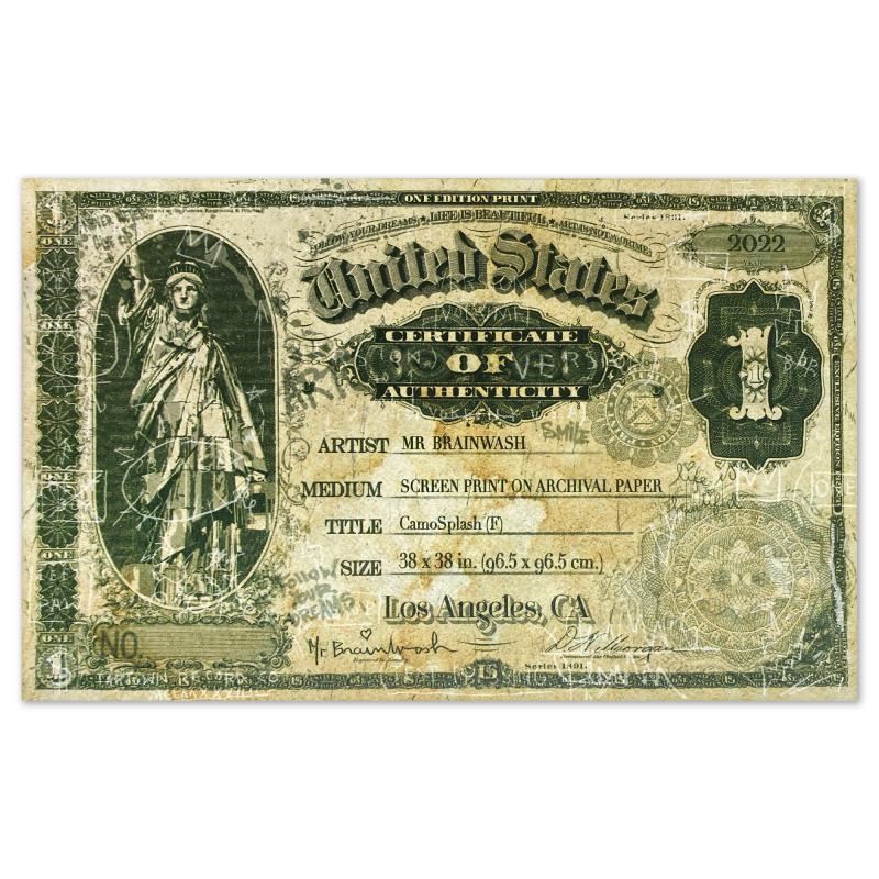 "Camo Splash F" is a limited edition silk screen print on paper by Mr Brainwash hand signed and thumb-printed by the artist. The piece comes custom framed with a Certificate of Authenticity. Measures approx. 42" x 42" (framed) 38" x 38" (image).