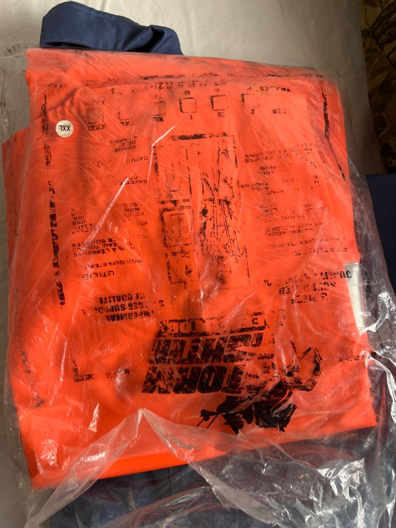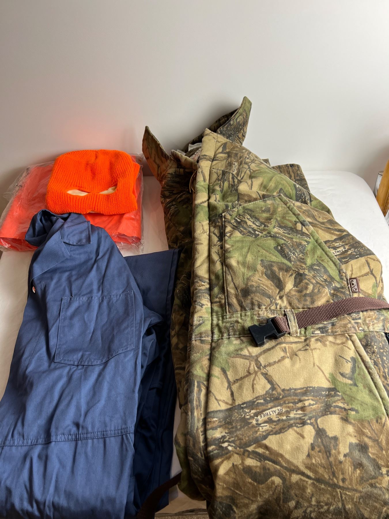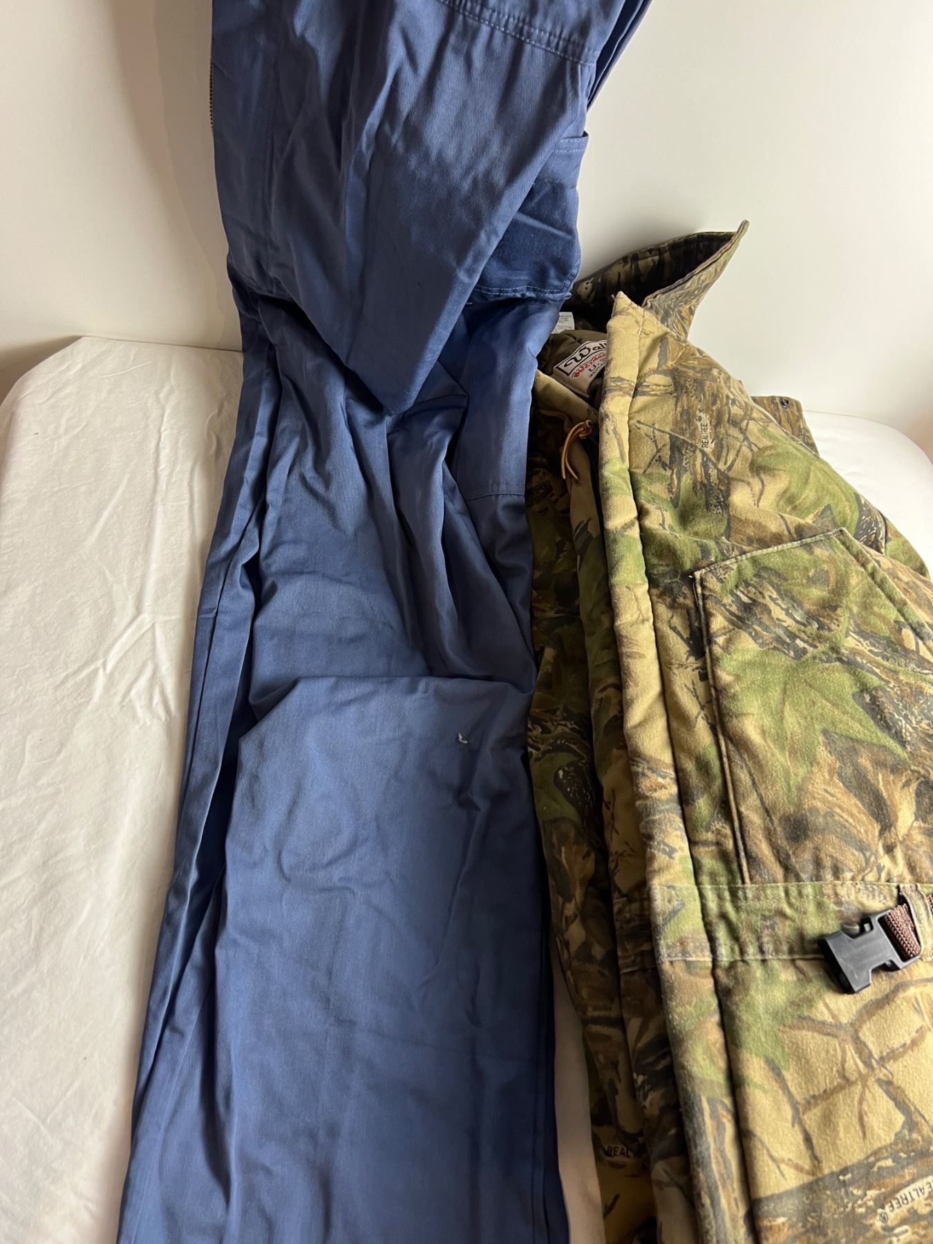 Includes, Walls Blizzard-Pruf Coveralls size XL Tall, Thinsulate Balaclava, Size 44T Coveralls, and more