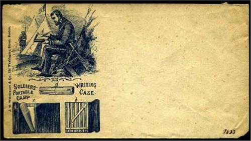 Camp Chair on Cover. Unused envelope, with blue illustration of soldier writing, seated in a camp chair, using a "Soldiers' Portable Camp Writing Case," as shown. Mounting traces on verso, else fine and unusual. Scarce.