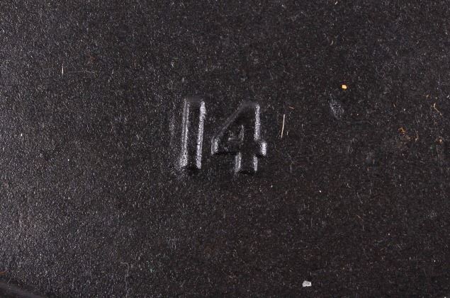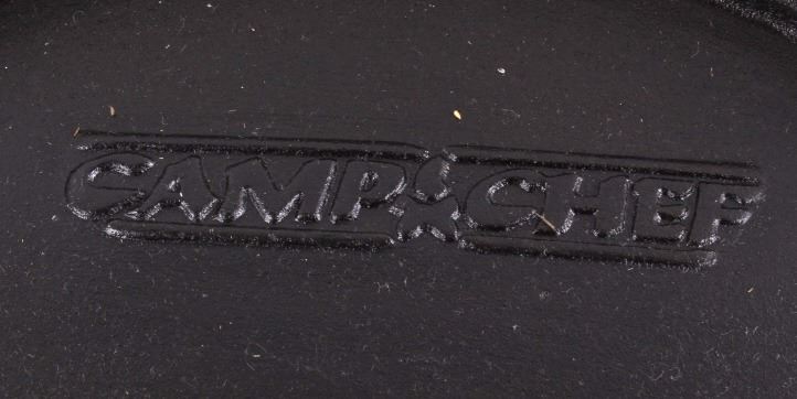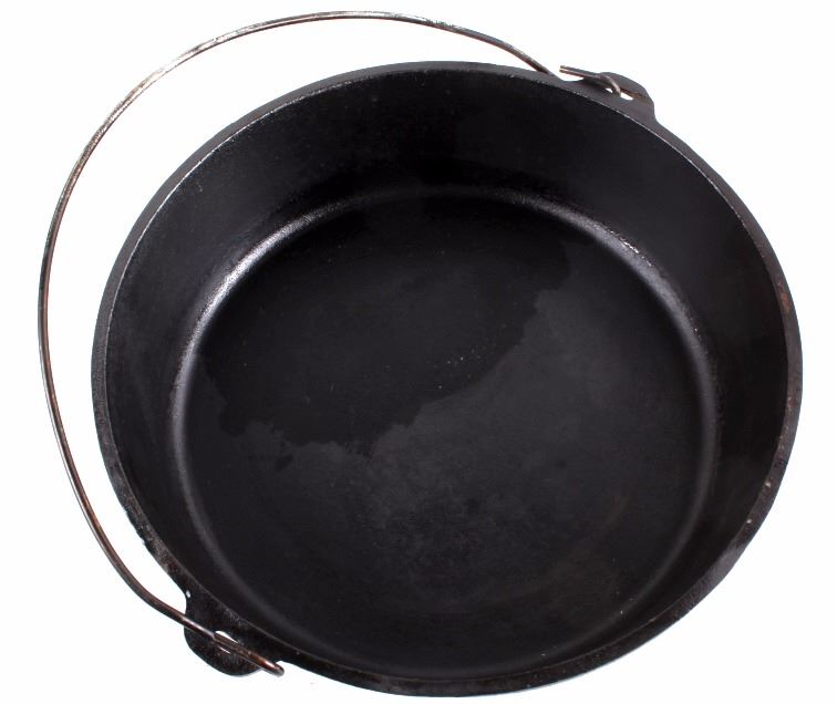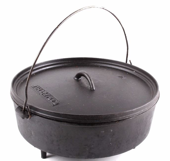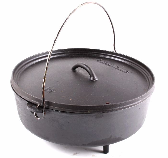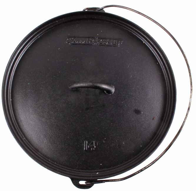 This lot has a large cast iron No. 14 Camp-Chef footed dutch oven. This Dutch oven features a large footed design with bale handle and matching lid. The footed design allows for even cooking by putting hot coals underneath. It is marked "Camp Chef 14." It is in good condition, with good seasoning. It measures 14 1/4" D. x 7 1/2" H