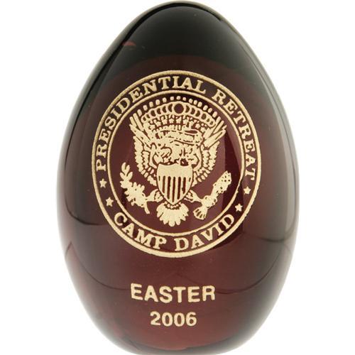 <B>Camp David Easter 2006 Presentation Easter Egg.</B></I> Unlike the other Easter Egg offered in this sale, this one is from Camp David, the well-known presidential retreat. Made from dark purple glass and engraved with the presidential seal and the words "Presidential Retreat - Camp David - Easter 2006." The seal and the letters display in gold and are offset nicely against the dark color of the egg itself. In mint condition.