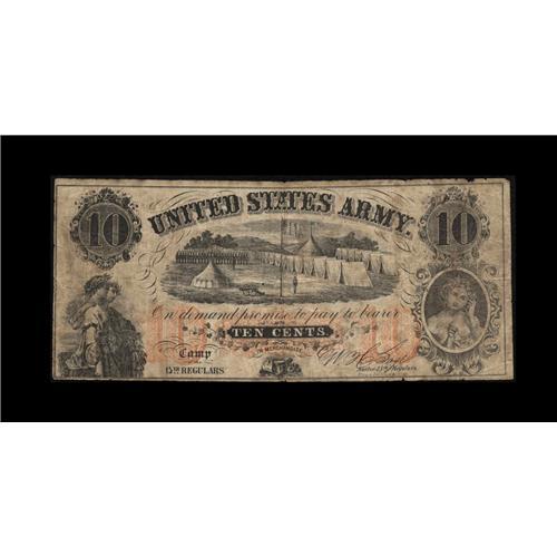 <B>Camp of the 15th Regulars- Wm. C. Gage, Sutler</B></I> 10¢ Keller UNL<BR>A very rare Sutler piece, with the Keller reference listing only a 5¢ denomination from this issuer. <B>Fine.</B></I>