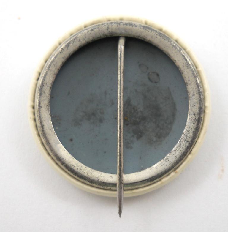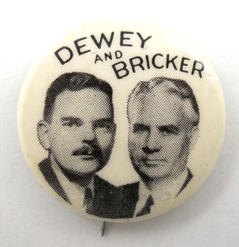 1" in diameter. This is a celluloid pinback from the 1944 election when the Republicans Dewey and Bricker ran against Roosevelt. This is in excellent condition with no foxing, cracks, splits, etc.