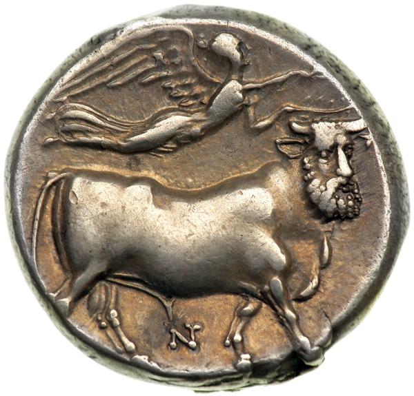Campania, Neapolis, c. 325-285 BC. AR Stater or Nomos (7.46 g). Head right of nymph wearing elaborate jewelry and headband; in lower left field, astragalos. Reverse: Man-headed bull walking right, being crowned by flying Nike. SNG ANS 374; cf. SNG Cop 437. Choice Very Fine.