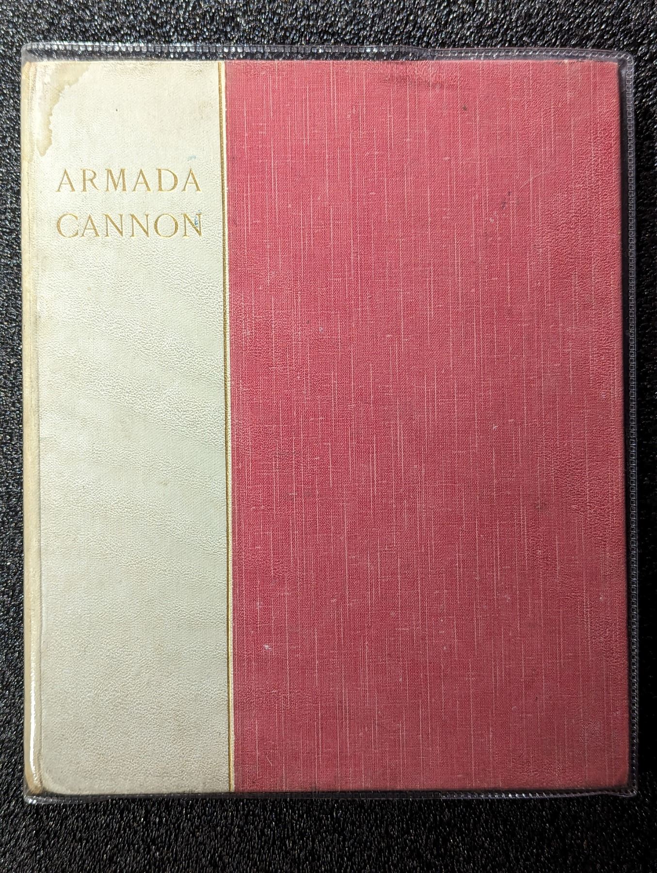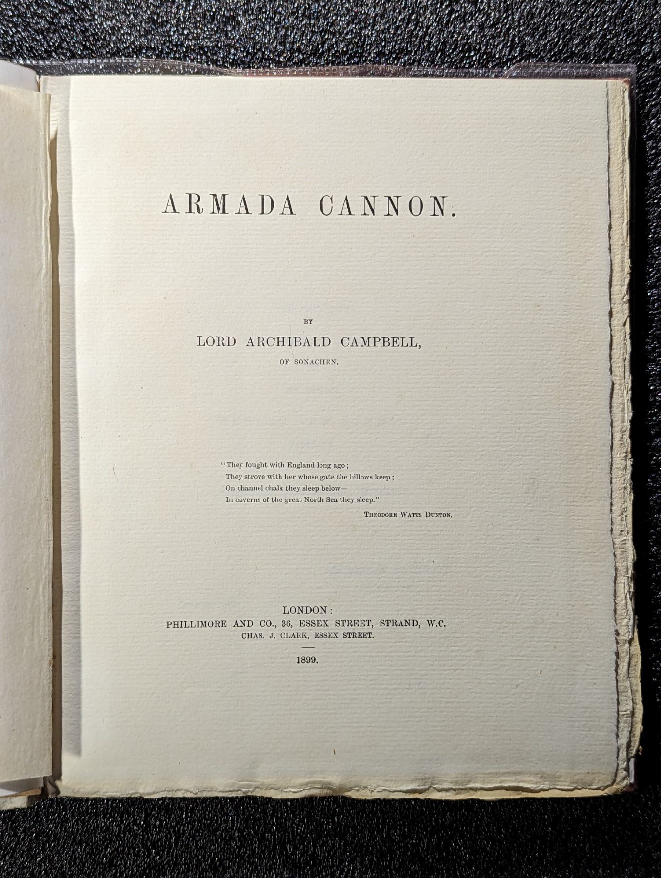 Campbell, Lord Archibald. ARMADA CANNON. Phillimore and Co., London. 1899. 8vo. 63 pages. Original white leatherette over red cloth, gilt, protective sleeve. First Edition. Table. Drawings. 10 b&w historical photos. English text. cover edges worn. Very Good. This book describes a cannon that was salvaged from the Spanish Armada galleon, "Florencia". The cannon was manufactured by Benvenuto Cellini. Lot weight: 0 lbs 14oz. Subject(s): Spanish Militaria.