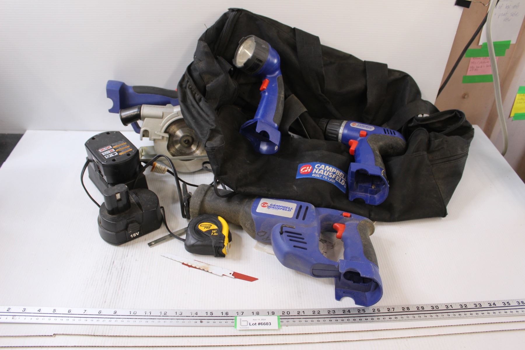 Campbell Hausfeld Cordless Flashlight, Drill/Driver, Circular Saw, Reciprocating Saw, Charger, (2) Batteries, Carrying Bag, Tape Measure, etc.