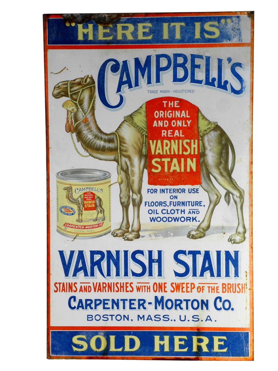 Campbell's Varnish Stain two sided tin flange sign. Carpenter-Morton Company, Boston. One side is rusty and worn, the other has some rust and fading, fair and good condition. 10 1/2 X 17 1/2 inches.