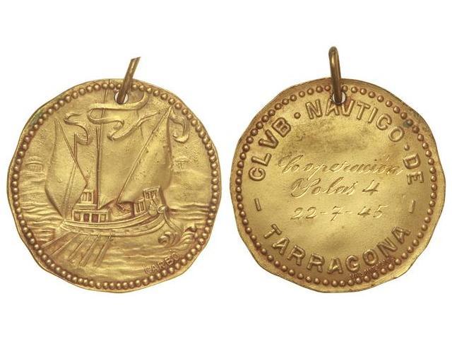 Campeonato Cooperación. Yolas 4. - 22-7-45. - CLUB NÁUTICO DE TARRAGONA. - Anv.: Galera. Rev.: Leyenda. Br. dorada. Ø 33 mm. Grabador: Carbó y Vallmitjana. Con anilla. CruM-1869a var. año. SC. - -