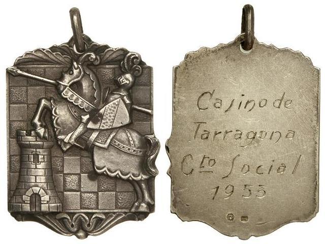 Campeonato de Ajedrez. - 1953. - CASINO DE TARRAGONA. CENTRO SOCIAL. - Anv.: Caballero y Torre, detrás tablero. Rev.: Leyenda grabada. 24,60 grs. AR. Ø 42x31 mm. Con anilla. EBC. - -