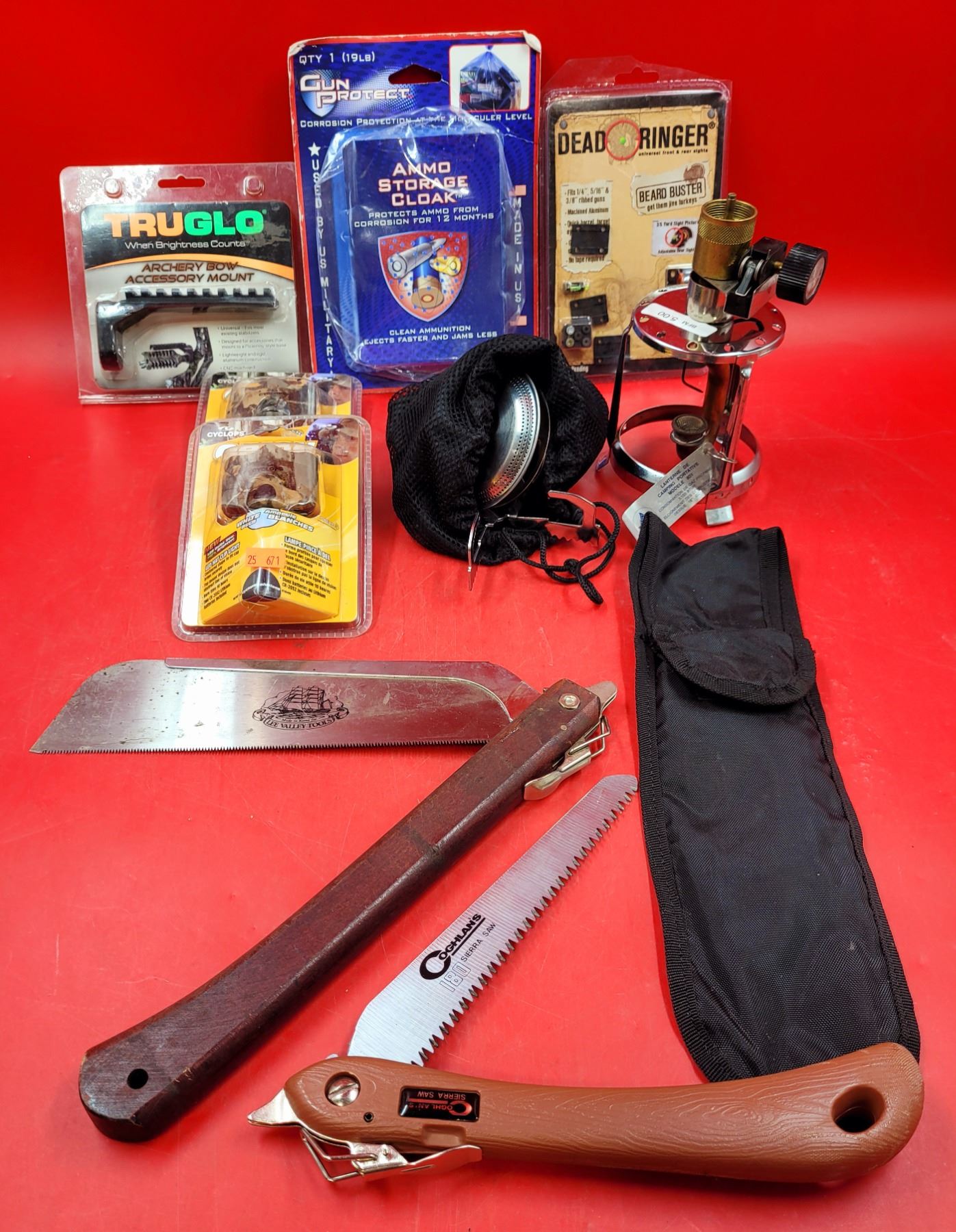 Camping & Hunting Lot w/ Folding Saws, Lantern, Archery Bow Accessory Mount, & More