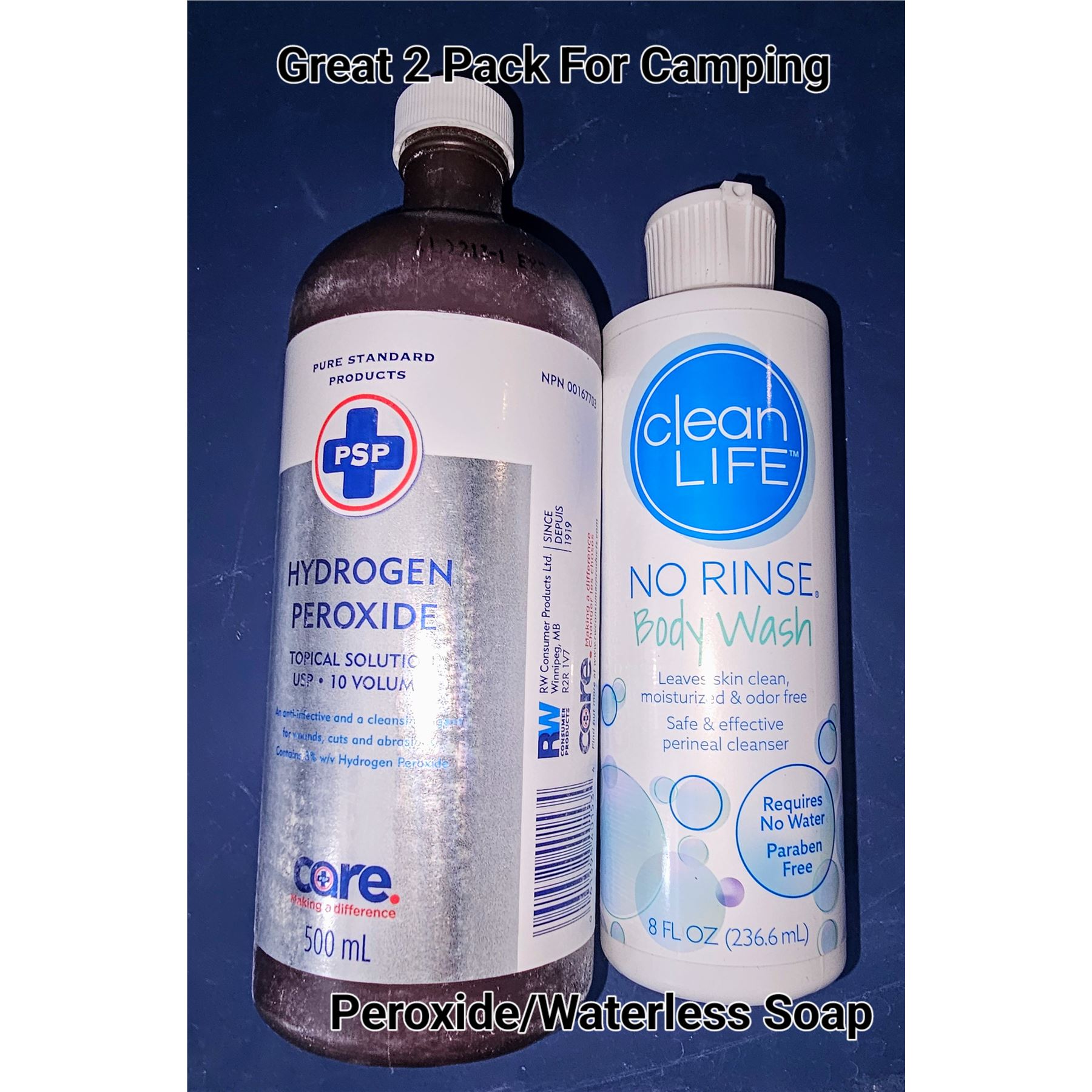Hydrogen Peroxide disinfectant for minor wounds, 500 mL. Waterless, no-rinse body wash, 236.6 mL, paraben-free, new.