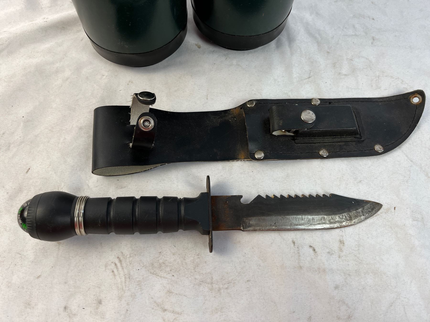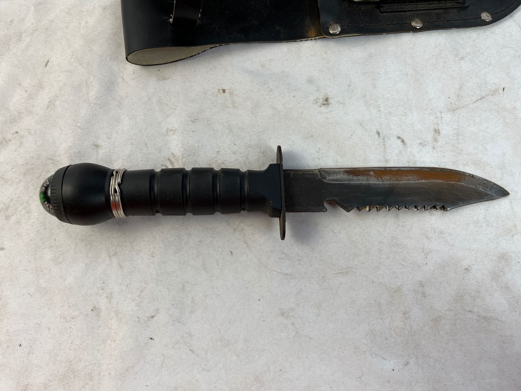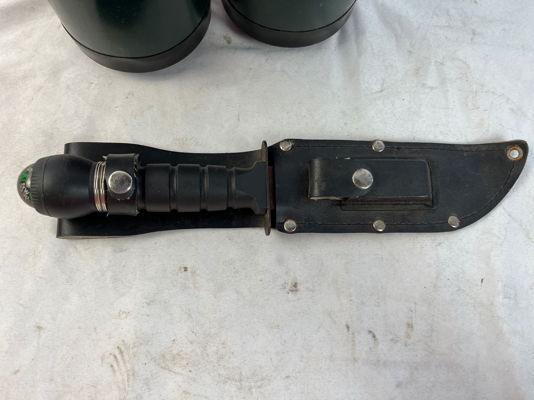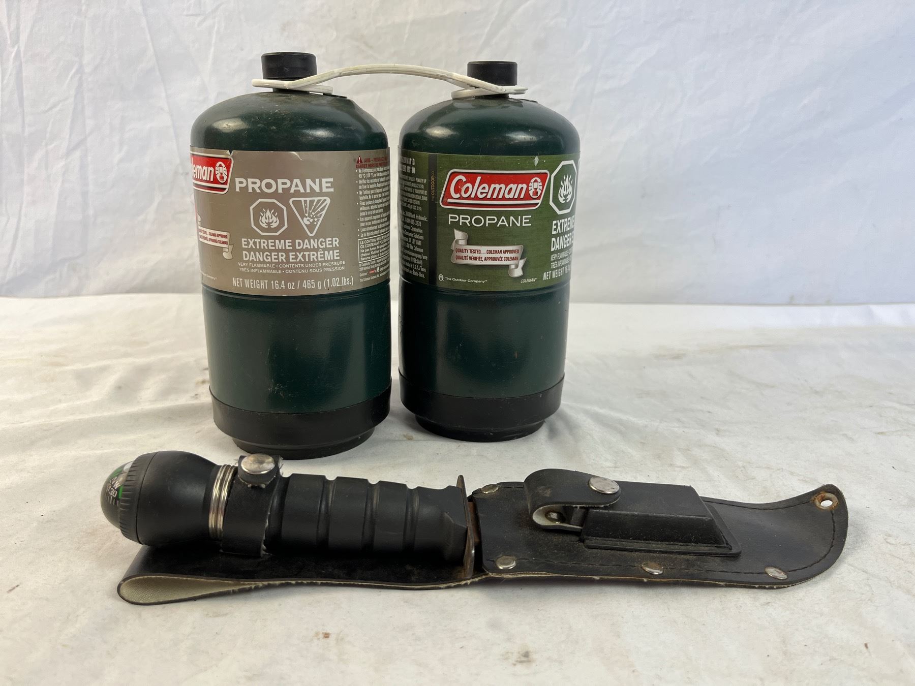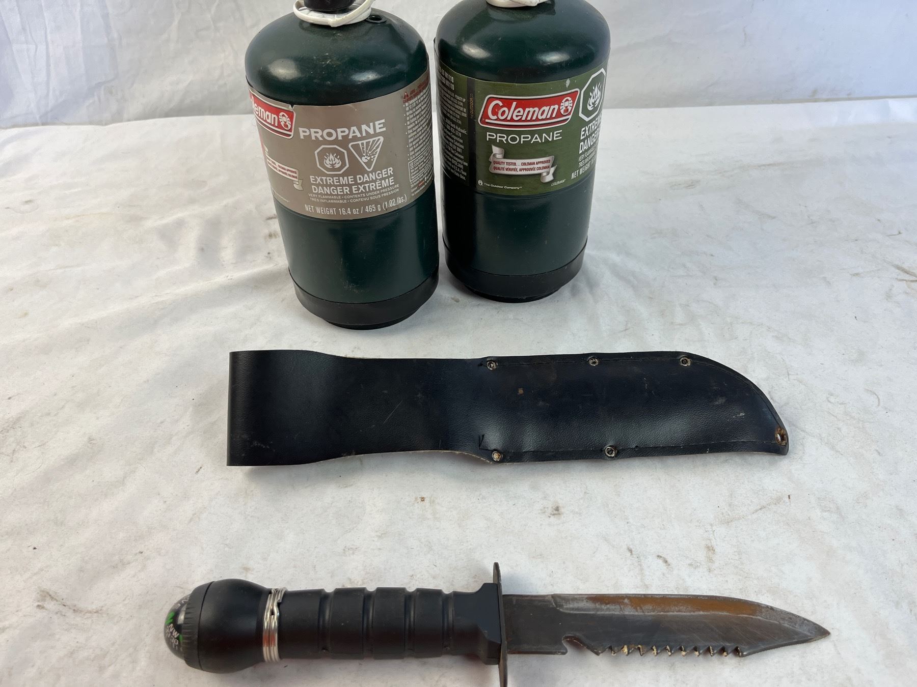 Two coleman miniature propane tanks and camping knife with compass and sharpening stone.